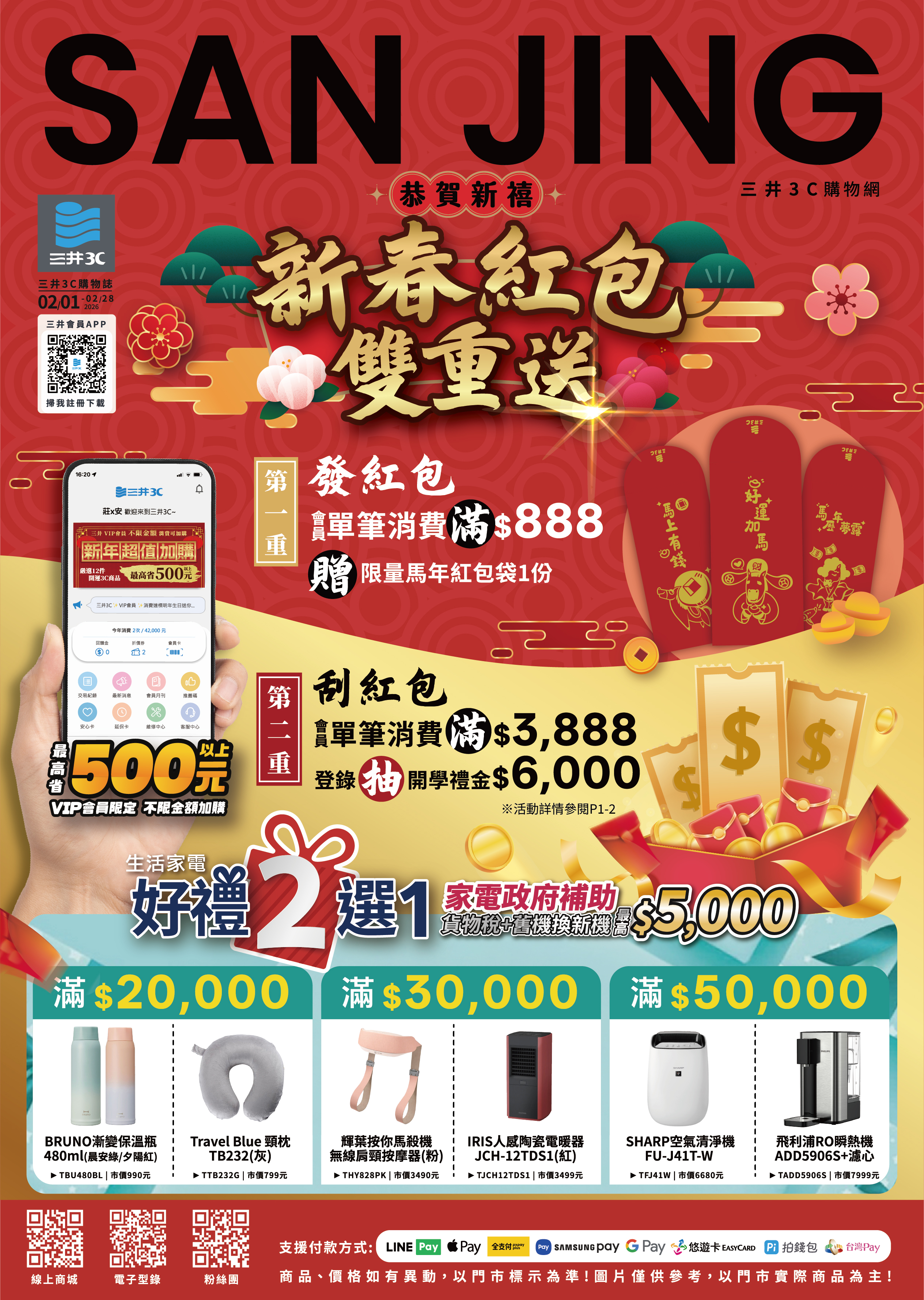 | ● 2026/02/01-2026/02/28 1. 滿額送:全館單筆消費滿$888送馬年紅包袋一份 ※ 贈品數量有限,送完為止 2. 滿額刮:全館單筆消費滿$3,888登錄玩刮紅包一次! 登錄網址 https://www.sanjing3c.com.tw/act/scratch-horse-Scratch ※ 限三井會員 ※ 須登錄發票(門市及購物網)/櫃台單號(大全聯及全聯) 獎項: ◆ 頭獎 6,000元電子紅包 --- 2名 ◆ 普獎:800元、600元、300元、200元、100元 |