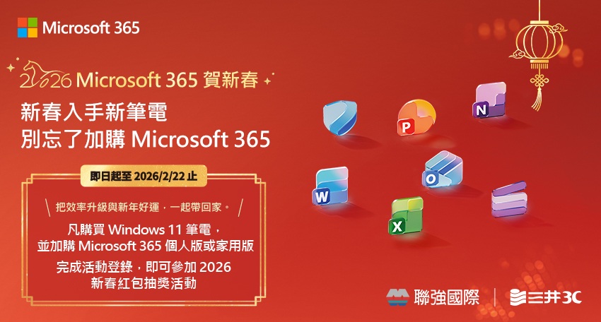 2026 Microsoft 365 賀新春 新春入手新筆電別忘了加購 Microsoft 365 即日起至2026/2/22止 |把效率升級與新年好運,一起帶回家。 凡購買 Windows 11筆電, 並加購 Microsoft 365 個人版或家用版 完成活動登錄,即可參加2026 新春紅包抽獎活動