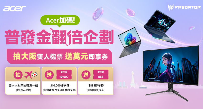 購買Acer搭載AMD處理器之筆電/桌機,活動網頁登錄且審核成功 1. 周周抽AAA+ACON雙人套票(價值$9,538X2=19,136),共四組。 2. 抽首爾4天自由行雙人遊(機+酒$30,000),共ㄧ組。 3. 購買Acer Nitro指定型號,活動網頁登錄且審核成功,登錄送Nitro 遊戲手把。 |