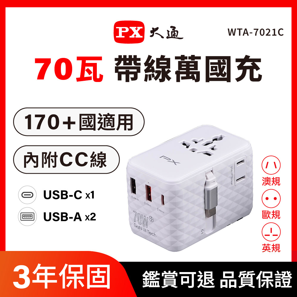 【PX大通】WTA-7021CW 70W帶線氮化鎵萬國轉接旅行插座 白色