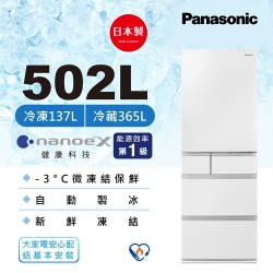 【國際牌】502L 五門鋼板冰箱 NR-E507XT-W1 白色|含基本安裝