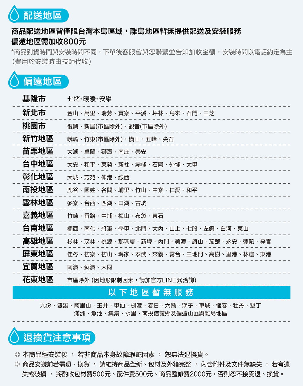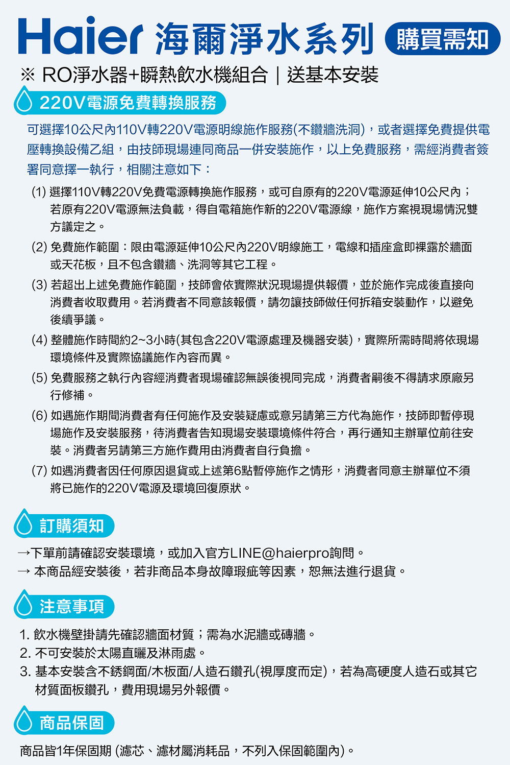 注意事項 →請優先確認安裝環境,也可搜尋官方LINE@haierpro詢問,避免技師到場無法安裝產生空趟費600元。 →本商品含基本安裝不銹鋼面/木板面/人造石鑽孔(視厚度而定) , 若為高硬度人造石或其他材質面板鑽孔費用現場另外報價。 →基本安裝為商品箱內原廠所附之材料零件安裝到位,若額外需求超出範圍之耗材,依施工內容由安裝技師現場報價。 →本商品經安裝後,若非商品本身故障瑕疵等因素,恕無法進行退貨。 →下單後商品於2~5個工作天內出貨(不含假日、國定假日),非快速出貨及安裝,急需安裝請透過實體通路購買,謝謝! →商品到貨時間與安裝時間不同,安裝時間以電話約定為主,安裝地屬於偏遠地區需加收800元。