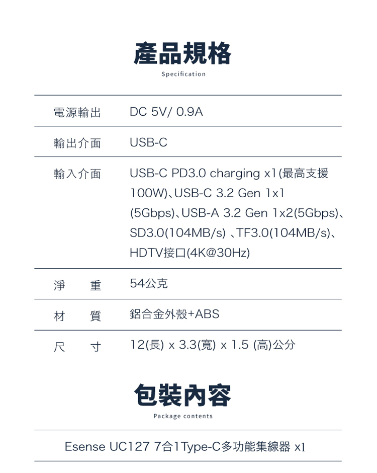 【ESENSE 逸盛】UC127 7合1 Type-C 多功能集線器