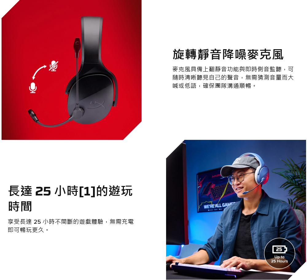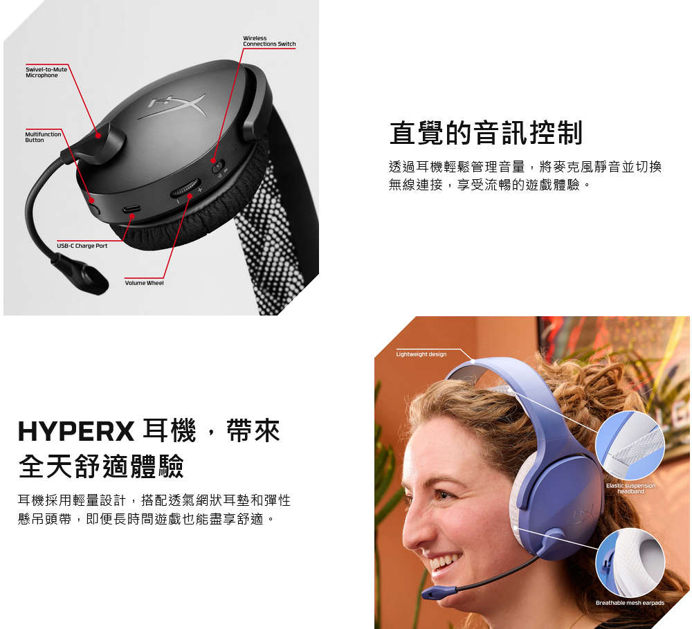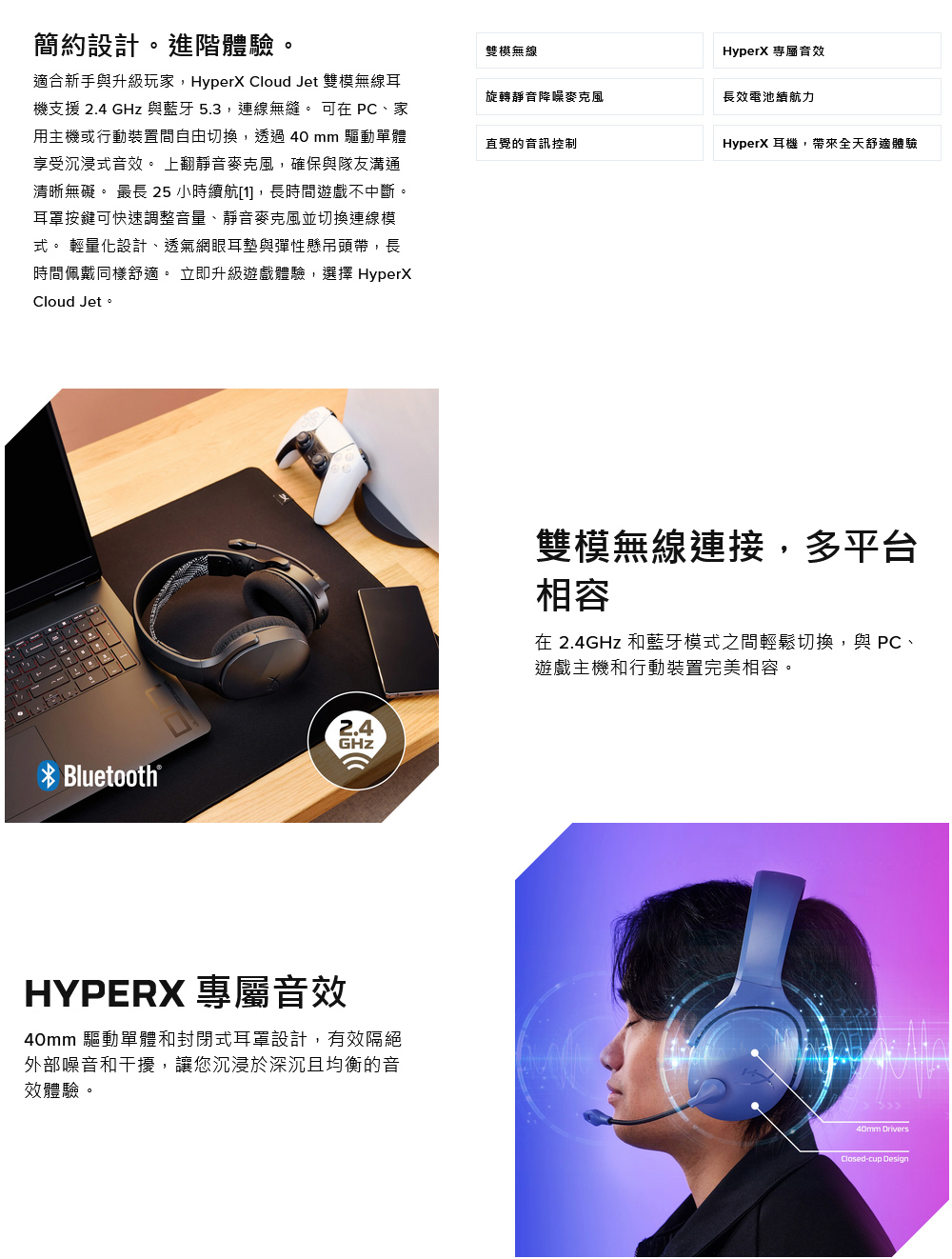品名:無線電競耳機 配戴形式:包耳式;封閉式 顏色:黑色 電池續航力:2.4GHz無線模式最長20小時;藍牙模式最長25小時 充電時間:4.5小時 連接方式:藍牙 線長:1.5米(4.92英尺) 耳罩材質:網布記憶泡棉 麥克風類型:駐極體電容式麥克風 頭帶結構:塑膠框架+彈性頭帶 頻率響應範圍:20Hz~20kHz 取樣率:48kHz 音訊靈敏度:103dB SPL/mW(於1kHz) 麥克風靈敏度:-16±4dB FS(於1kHz) USB音訊格式:立體聲 USB版本:USB 2.0 無線類型:2.4GHz、藍牙 無線範圍:最遠15公尺 總諧波失真:≦2% 驅動單體類型:動圈式;40mm單體 相容平台:PC、Mac、PS5、PS4、手機;軟體支援NGENUITY 重量:耳機約295g;無線接收器約4g 保固:原廠兩年保固 包裝內容:耳機、2.4GHz USB Type-A無線接收器、USB充電線、快速入門指南