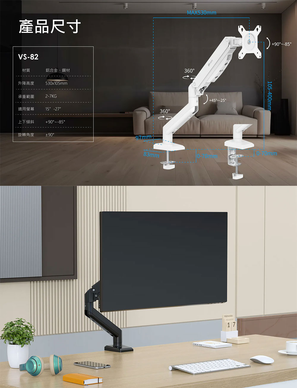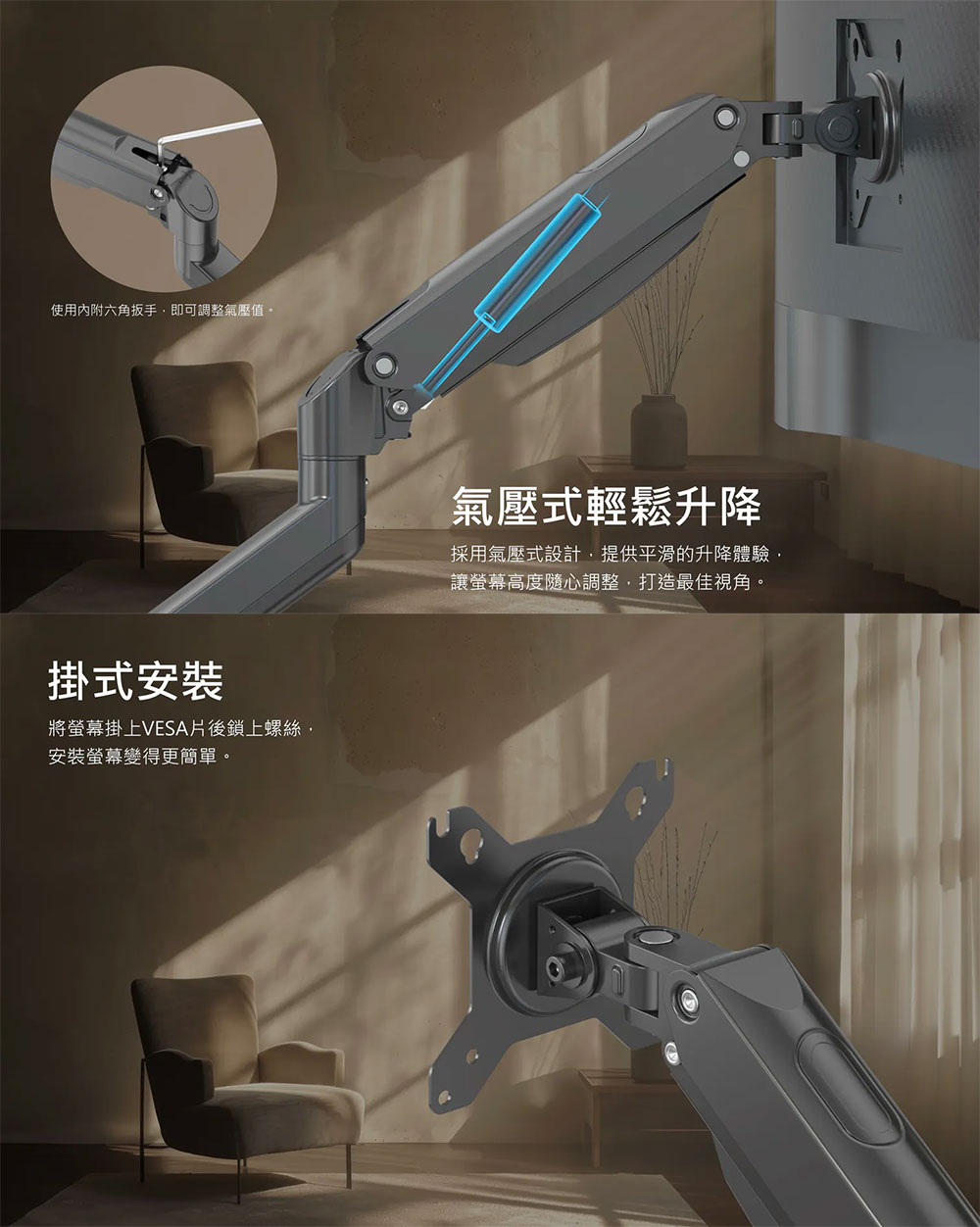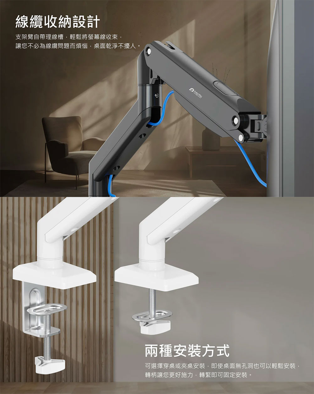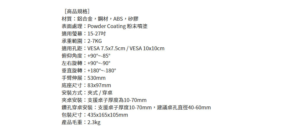 • 下支臂採用鋁合金打造,支架核心結構堅固耐用,適用於7公斤內的27吋以內螢幕