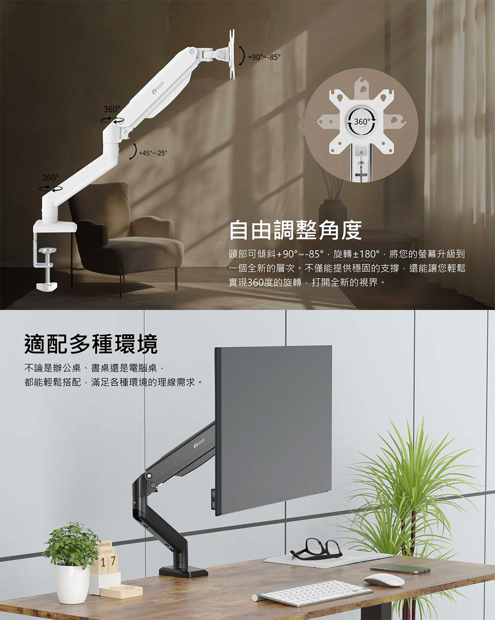 • 螢幕可垂直360度旋轉,正90度負85度俯仰調整,180度左右調整