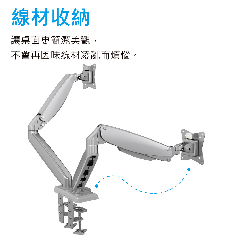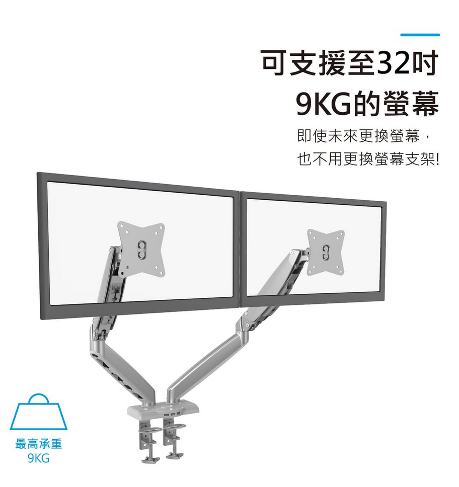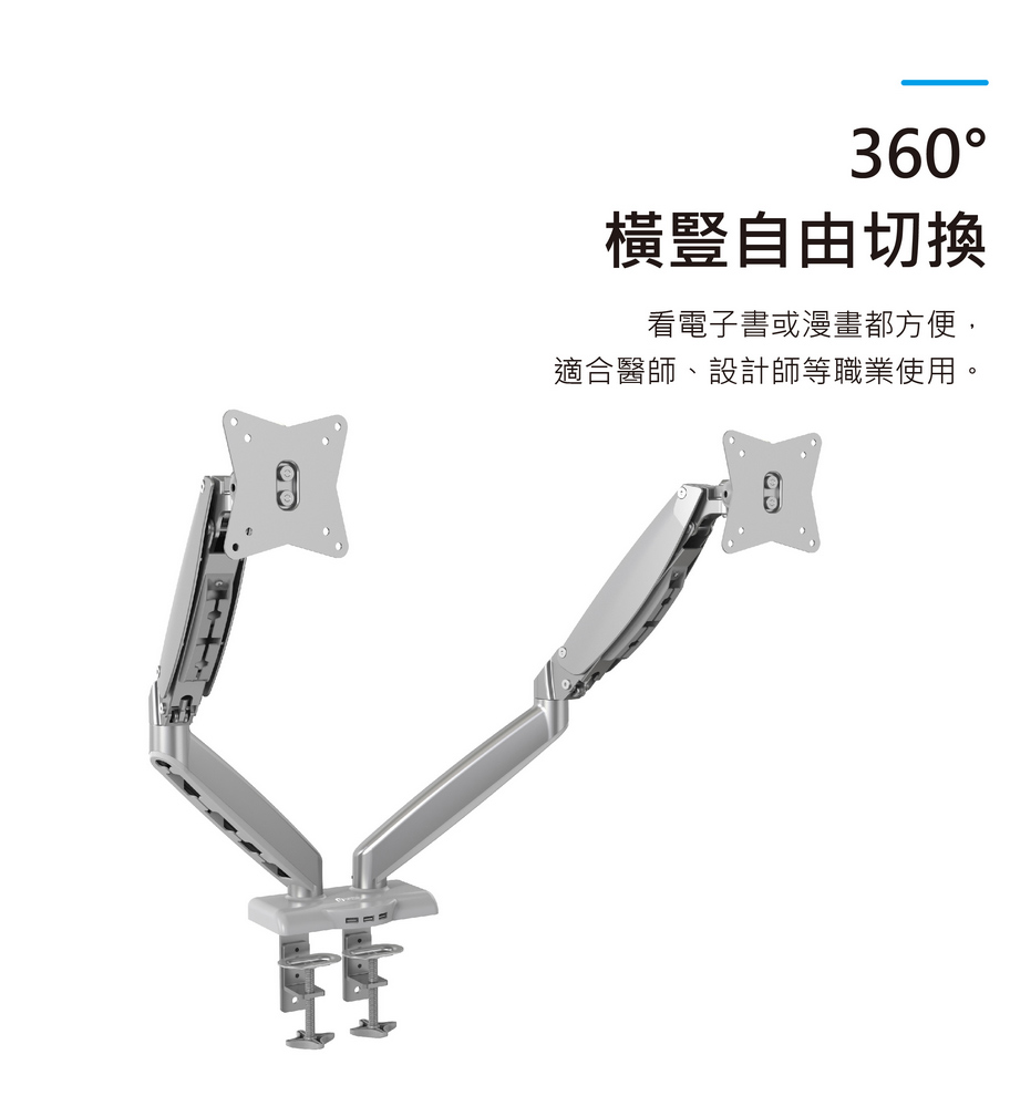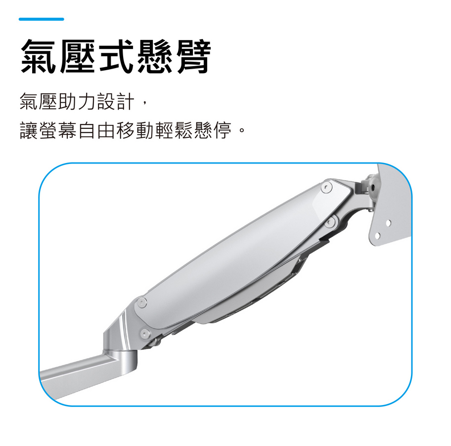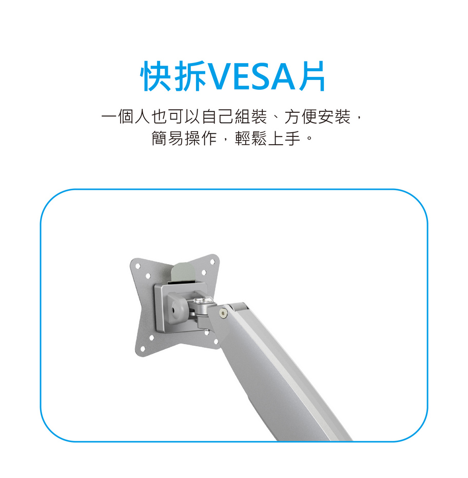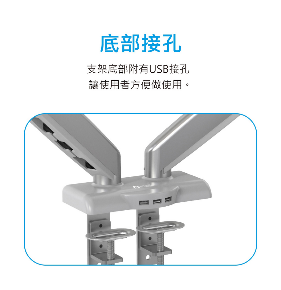 [商品敘述] 1. 支臂與底座均由航太級鋁合金打造,表面採用氧化工藝處理永不掉色,整體質感細緻,屬精品級專業螢幕支架 2. 金屬主幹結構硬度高剛性強,能夠支撐大尺寸與大重量螢幕,每個螢幕承重力高達9公斤 3. 氣壓式伸縮支架,一指升降,輕鬆懸停,螢幕上下移動超容易 4. 可調角度大,利用三軸旋轉設計,達到螢幕水平360度旋轉 5. 螢幕可垂直360度旋轉,正85度負90度俯仰調整,180度左右調整,想要橫看豎看,各角度觀看,輕鬆自如 6. 採用先進的快拆卡扣式安裝設計,將螢幕安裝於支架上時,更快更便捷,獨自一人也能輕鬆安裝 7. 能夠有效整合桌面空間,消除肩頸壓力與舒緩脊椎壓迫,減少身體傷害 8. 底座帶有三個USB3.0高速連接孔,方便使用者串聯鍵盤,滑鼠,隨身碟等裝置,也可對手機與平板等裝置進行充電 9. 安裝過程簡單容易,支架臂與中柱帶有線材收納設計,維持桌面簡潔美觀 10. 採用國際標準VESA 75x75與100x100孔距,適用於市面上絕大多數螢幕 註:螢幕需符合VESA 75x75或100x100壁掛規範 註:氣壓臂出廠預設值為4KG,請依照螢幕重量自行調整氣壓臂扭力 註:若螢幕過重,請將氣壓往+調節。若螢幕過輕,請將氣壓往-調節 註:如果您的螢幕裝上去後自動彈起來,請您將氣壓調節「持續地」往減號[-]方向轉,直到支架用起來順暢為止 注意:因尺寸限制,超商取貨最多一次1個,超過2個請選宅配寄送