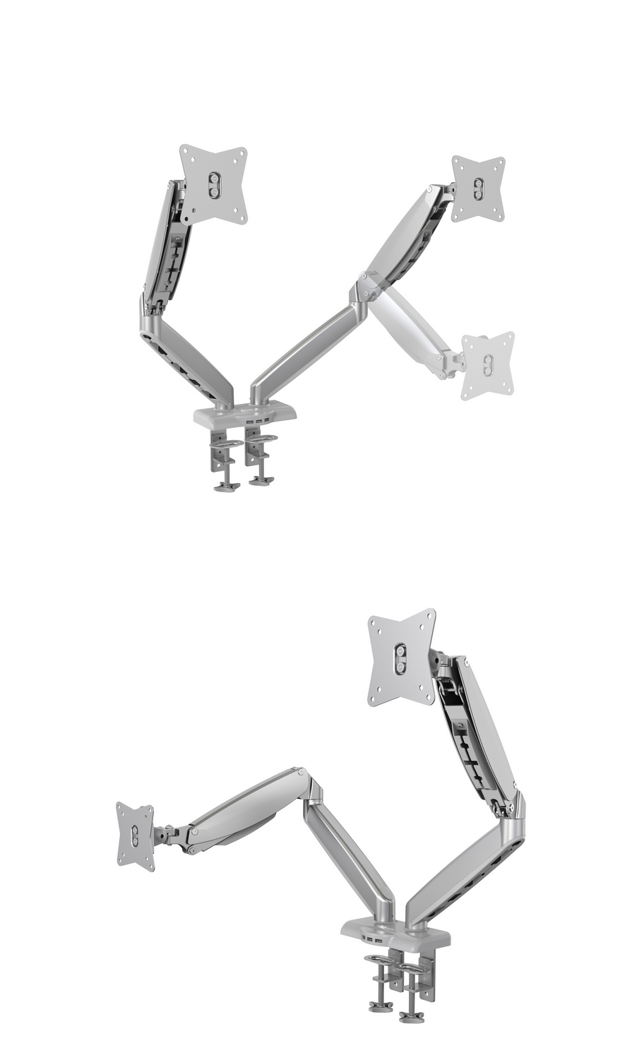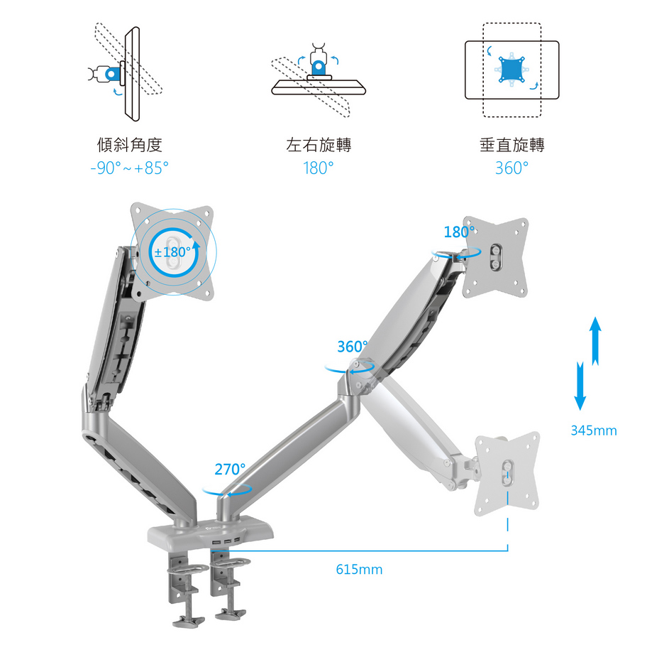 [商品規格] 適用螢幕:每個螢幕15-32吋 承重範圍:每個螢幕9KG 適用孔距:VESA 7.5x7.5cm / VESA 10x10cm 俯仰角度:+85°~-90° 左右旋轉:+90°~-90° 垂直旋轉:+180°~-180° 安裝方式:夾式 夾桌安裝:支援桌子厚度為10-90mm 氣壓耐受度:50000次升降 保固:非人為因素損壞保固一年