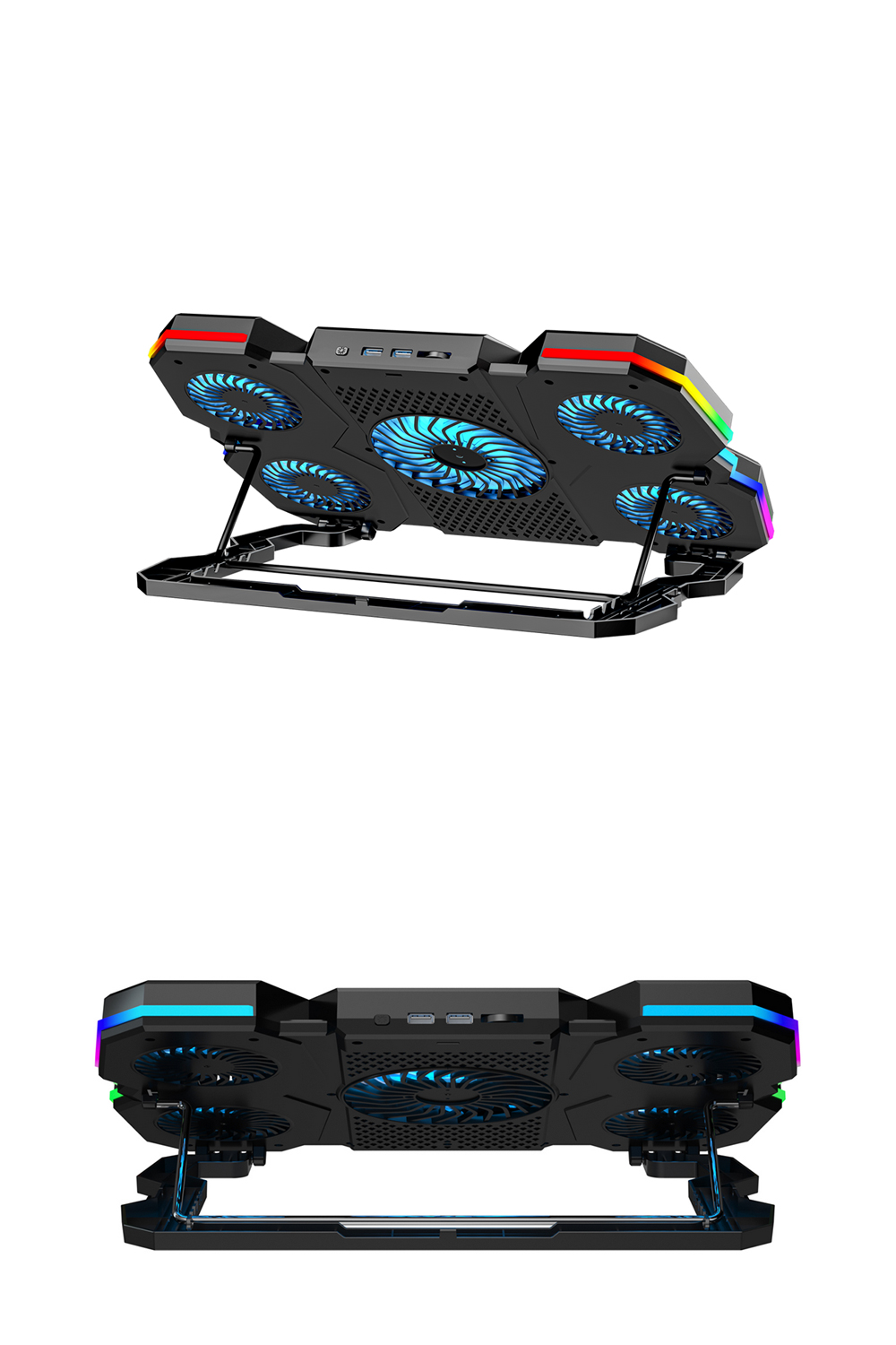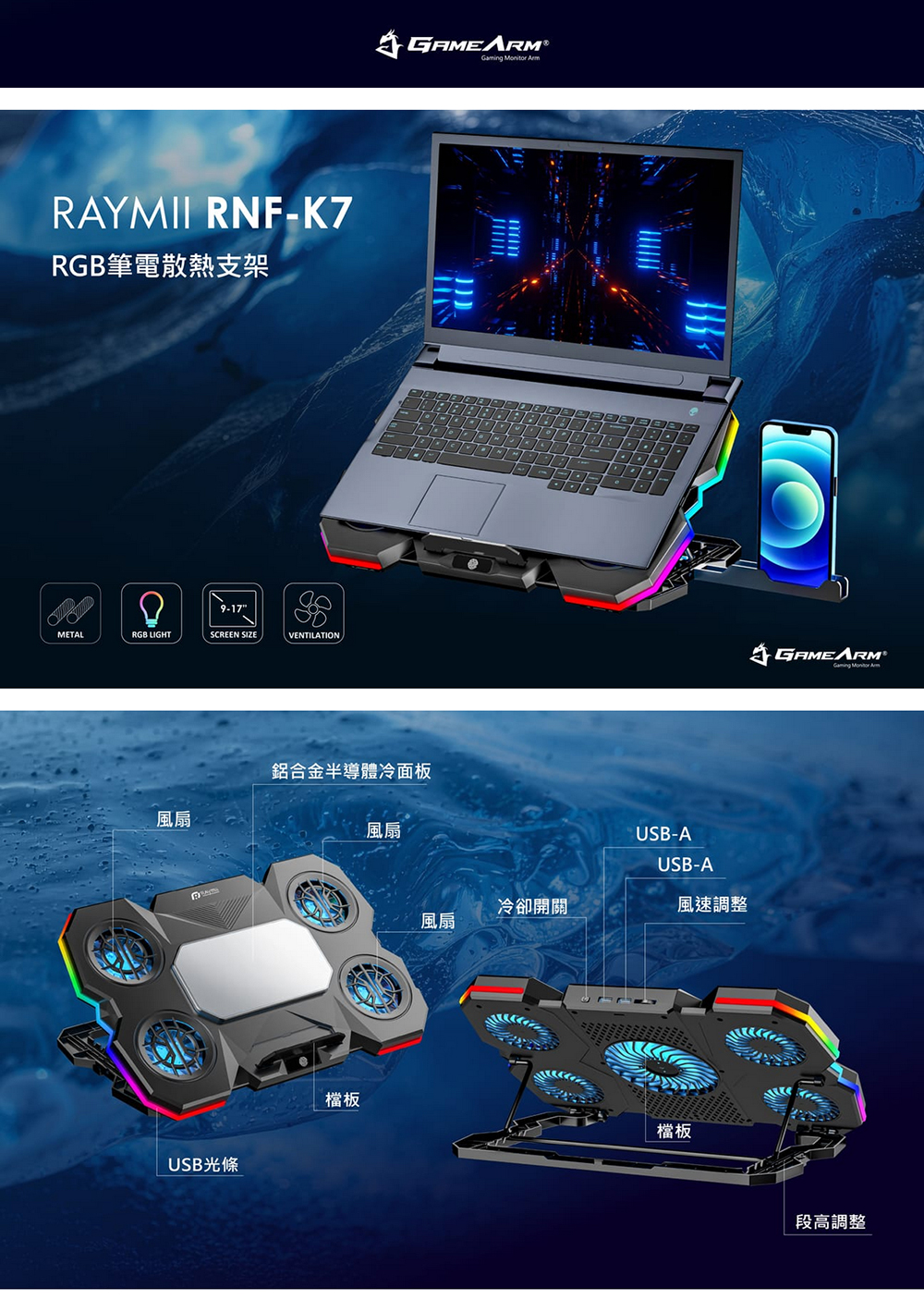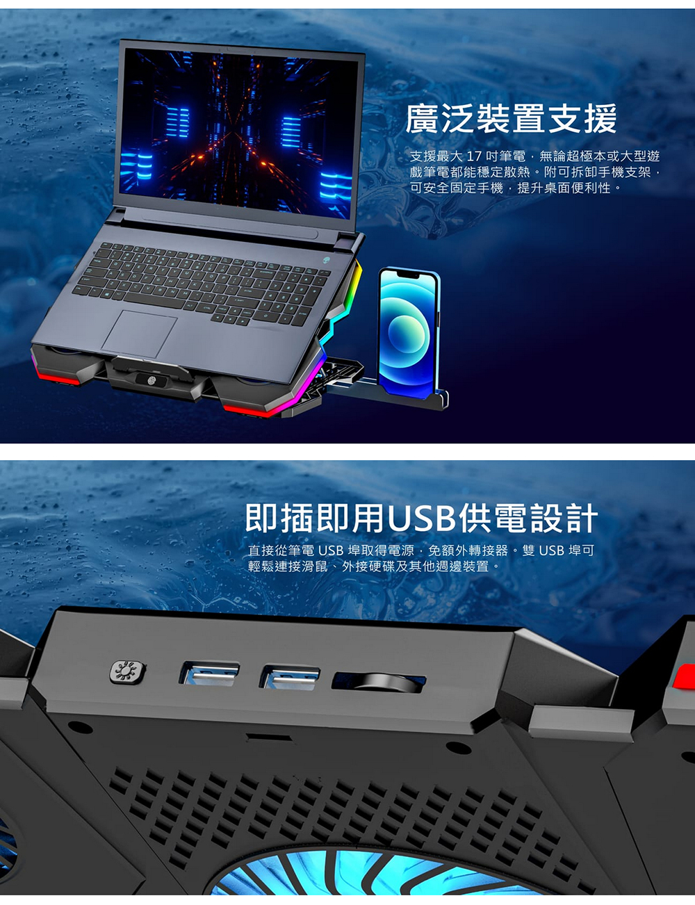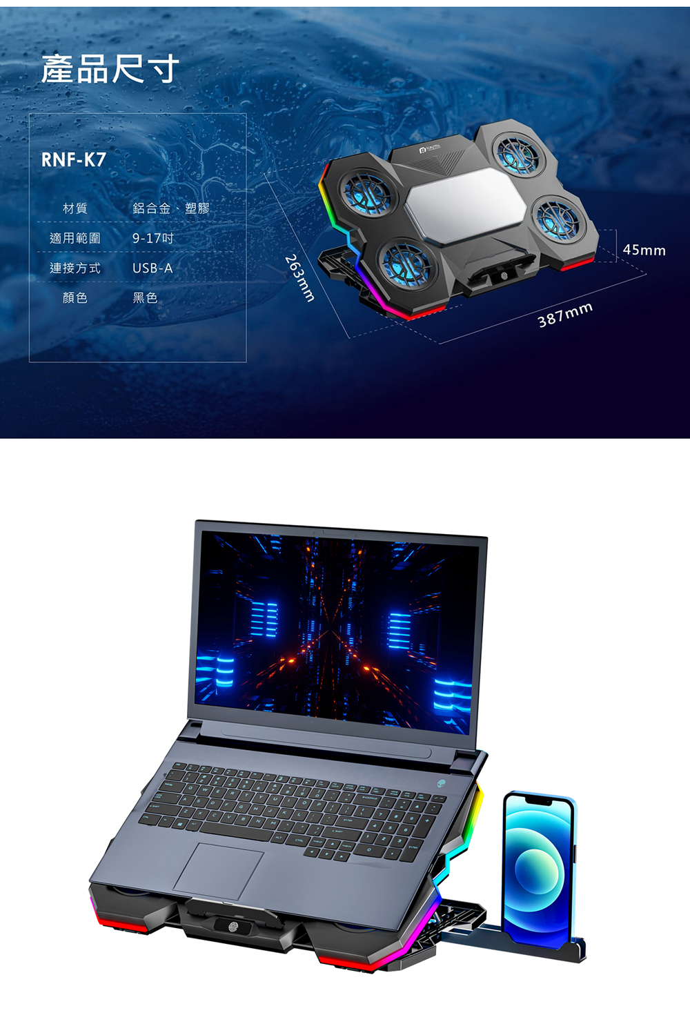 [商品特色] 1. 升級你的工作與遊戲桌面體驗!一款兼具散熱功能與風格的RGB發光筆電支架,讓筆電更加酷炫地工作與散熱 2. 支架正中央裝備鋁合金電熱冷卻器,半導體製冷,金屬降溫速度快,您可以主動控製冷卻,節省能源,延長散熱器的使用壽命 3. 5 個超級散熱風扇!這款 5 核心筆記型電腦散熱墊在機殼頂部和底部都有通風口,可以有效地為您的筆記型電腦散熱 4. 強大的 65 CFM 氣流可確保高效散熱,保持最佳溫度,防止過熱降頻,從而提升筆記型電腦的效能 3. 符合人體工學的舒適設計,提供 5 檔高度調整選項。可依使用情境選擇最合適的筆電傾斜角度,降低肩頸、手腕負擔,提升長時間工作或遊戲的舒適度 4. 提供強勁氣流幫助筆電保持冷靜,讓高強度運作與遊戲不卡也不悶,有效降低筆電長時間運作時的溫度 5. 您可以透過觸控按鈕輕鬆控制RGB燈光,利用旋鈕調整風扇轉速,快速容易,簡單直覺 6. 可支援17吋筆電。底部簍空設計,快速散出筆電溫度。有效托高筆電,提高視角設計,符合人體工學,適合電腦長時間使用者,舒緩肩頸及腰部酸痛 7. 支架可進行 5 級角度調整,讓使用者能選擇最符合姿勢需求的高度與傾斜角,不論坐著、站著或靠著使用筆電,減少頸椎與背部的負擔 9. 裝置具備雙 USB A 輸入介面,讓你在使用風扇降溫的同時,仍能外接滑鼠、鍵盤、隨身碟等裝置,不占用筆電原本的連接孔 10. RGB燈效加持,具有動態彩虹流光與靜態RGB模式,讓你的桌面瞬間升級為潮流 / 遊戲風格,既實用又有態度 11. 這款散熱筆電墊的RGB燈光效果酷炫,擁有多種燈光選項,可以營造出酷炫的遊戲氛圍。您可以按住按鈕2-3秒開啟/關閉燈光 12. 附有手機擺放支架,能夠將手機立於筆電兩側,遊戲高速戰鬥時不漏接訊息;也可以同時間雙屏顯示以增加工作效率 13. 運作安靜,同時具備強力氣流、即便風扇高速運行,也盡量維持低噪音,兼顧效能與安靜環境 14. 遊戲玩家:風扇+RGB氛圍燈讓桌面升級,同時筆電更冷靜、FPS更穩定。 15. 創作者/剪輯師:長時間用機,高效散熱+好姿勢=減少不舒服狀況。 16. 居家辦公/混合工作者:想提升桌面質感與工作效率,一支搞定。 17. 筆電型號大於 15 吋、常需高效運行的使用者:專為大尺寸機型設計 18. 具備可翻起擋板防止筆電滑落,將筆電放上即可使用。 最佳使用筆電支架方式,建議搭配外接鍵盤與滑鼠,更能達到人體工學之效果 ✅ 電熱鋁合金冷卻模組 —— 金屬導體,主動式高速散熱 ✅ 5個高速風扇 —— 高效降溫,保持穩定效能 ✅ 5段可調角度 —— 減少頸椎與手腕負擔 ✅ 動態與靜態RGB燈效 —— 打造你的專屬「氛圍桌」 ✅ 可外接手機支架 —— 高速戰鬥時訊息不漏接 ✅ 可折疊收納、輕巧便攜 —— 居家、辦公、出差都能隨身帶走