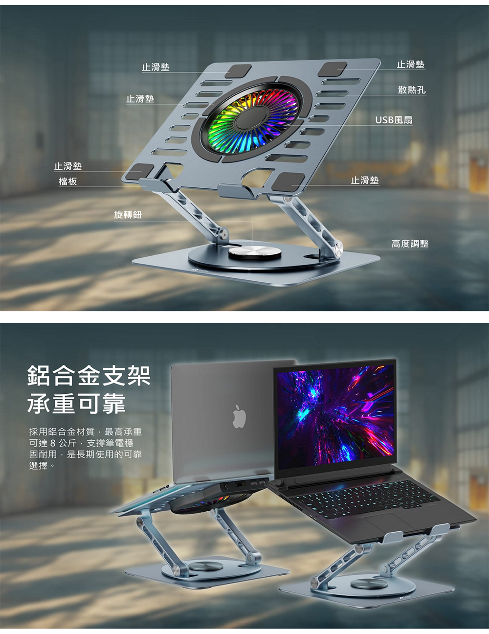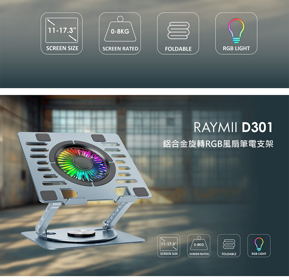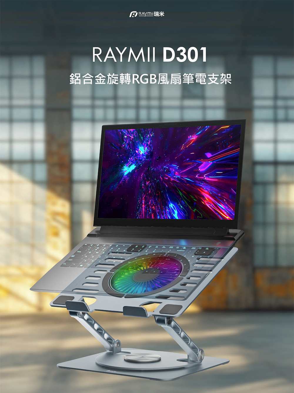 【Raymii 瑞米】D301 鋁合金RGB風扇旋轉筆電支架
