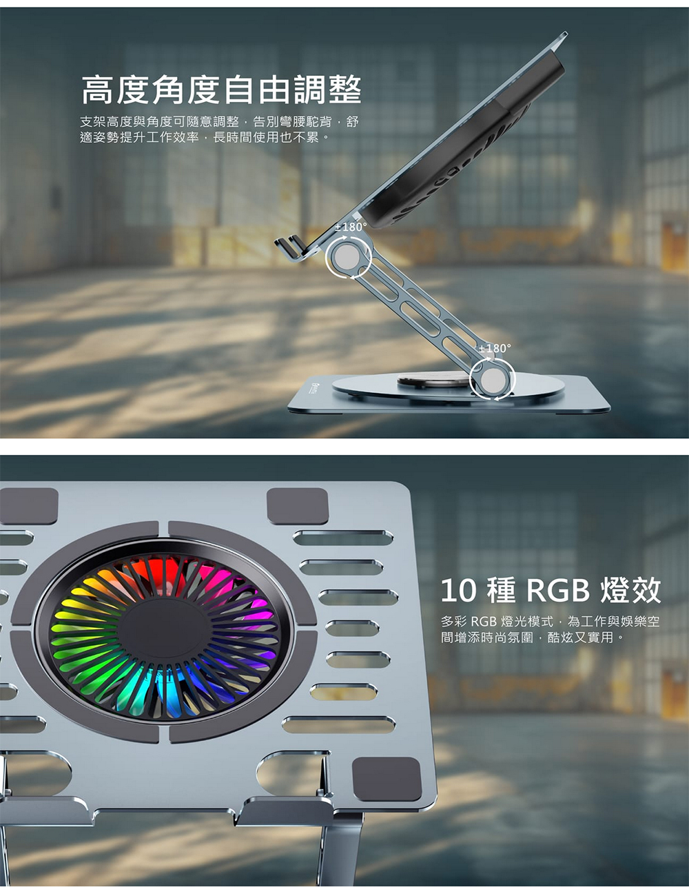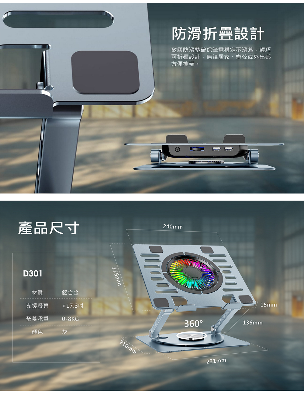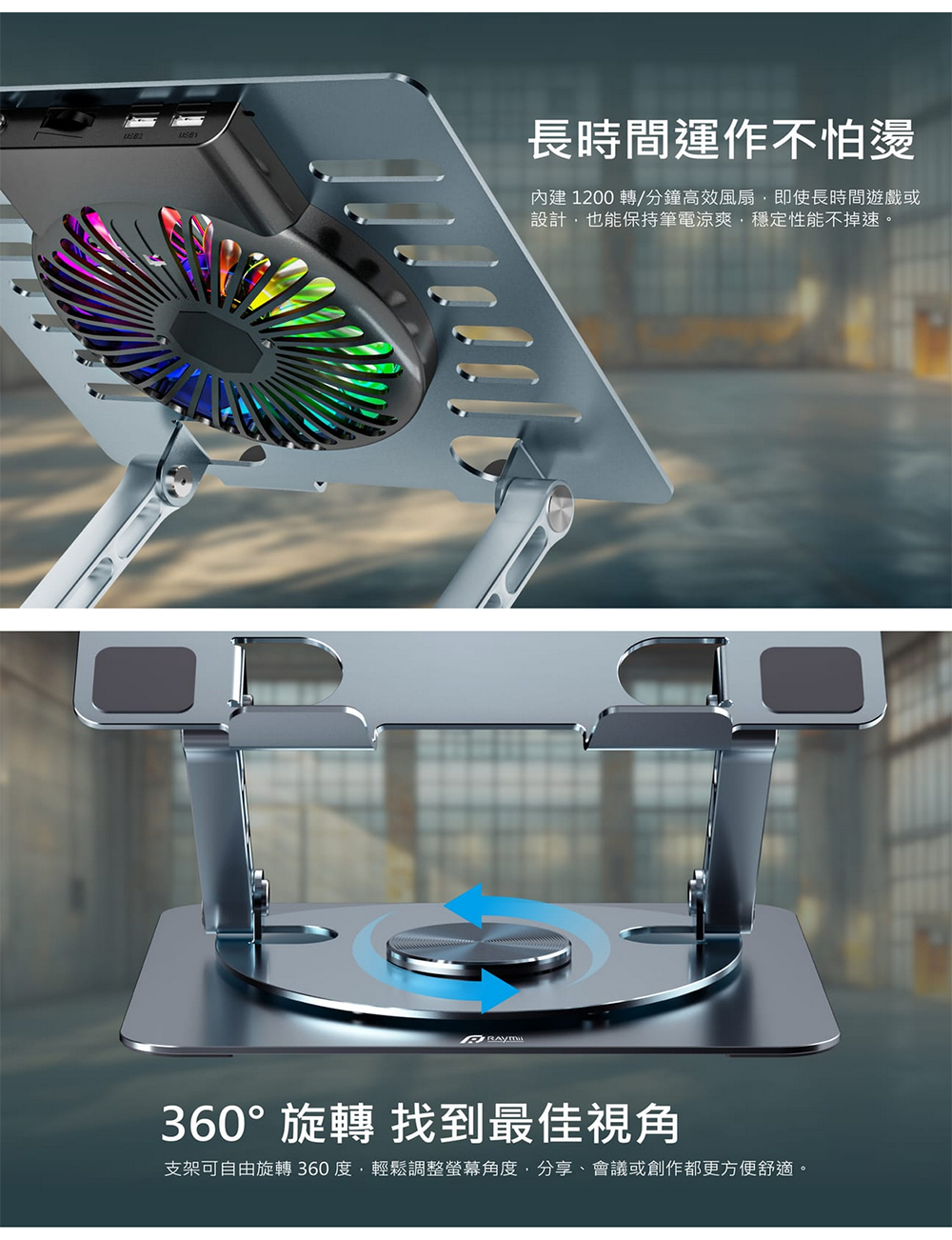 【Raymii 瑞米】D301 鋁合金RGB風扇旋轉筆電支架