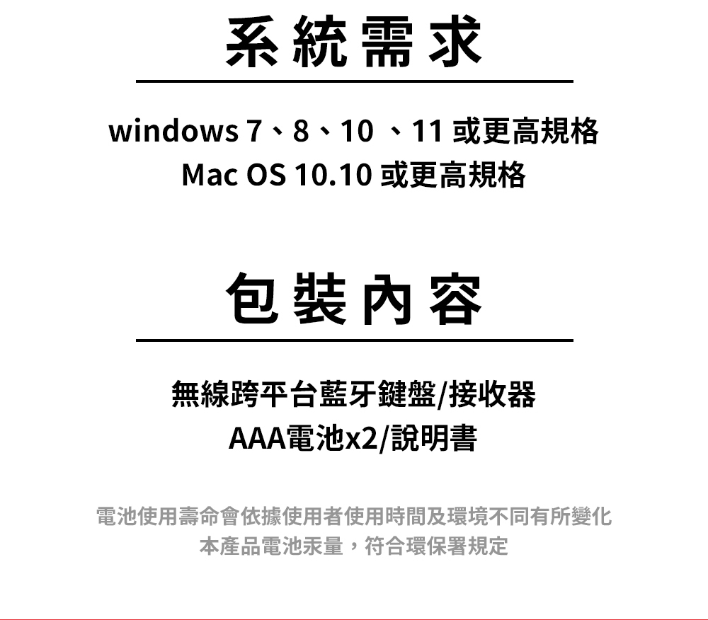 包裝內容無線跨平台藍牙靜音鍵盤/USB無線接收器/AAA電池x2/說明書