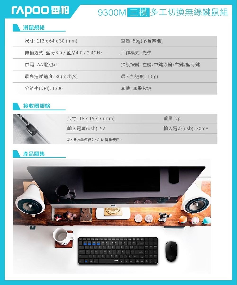 【Rapoo 雷柏】9300M 無線刀鋒式超薄三模鍵盤滑鼠組