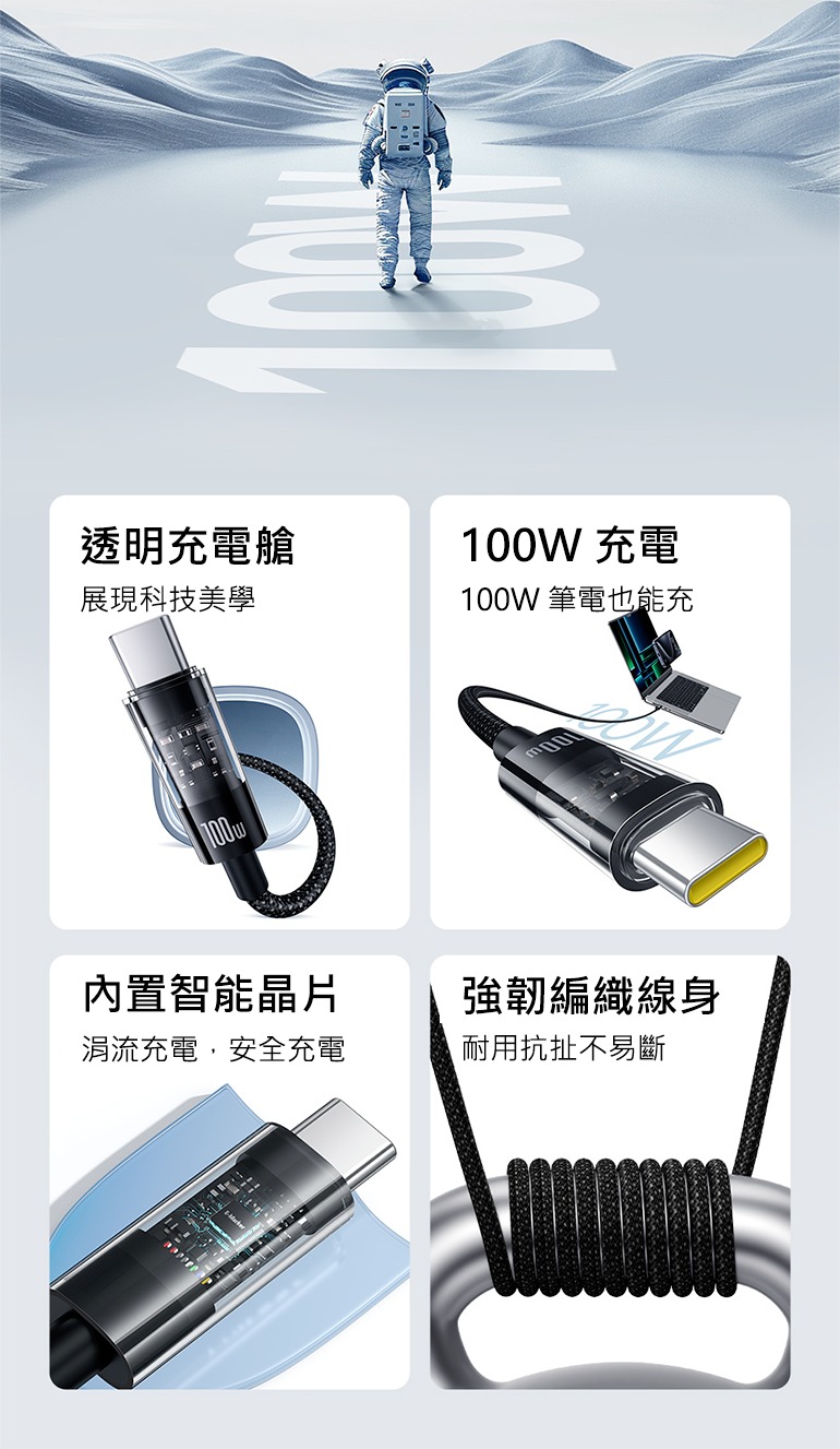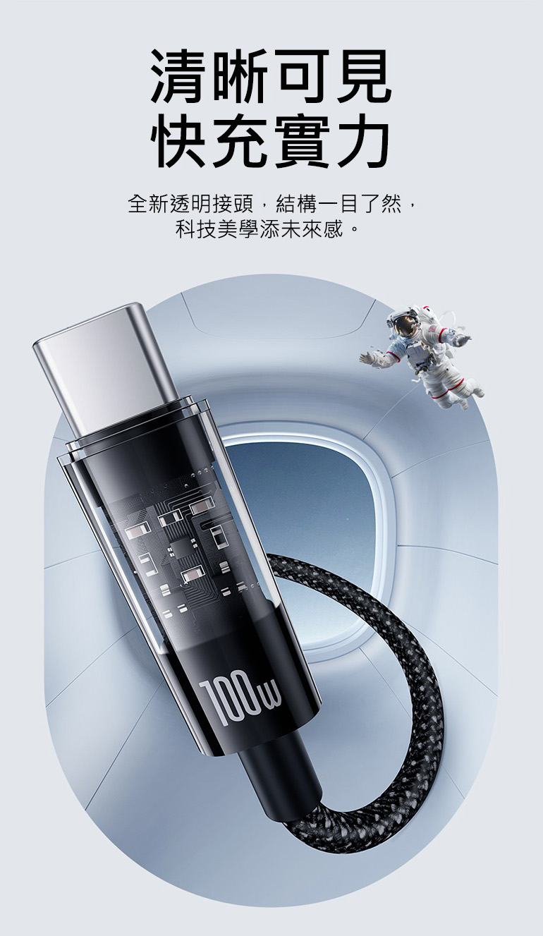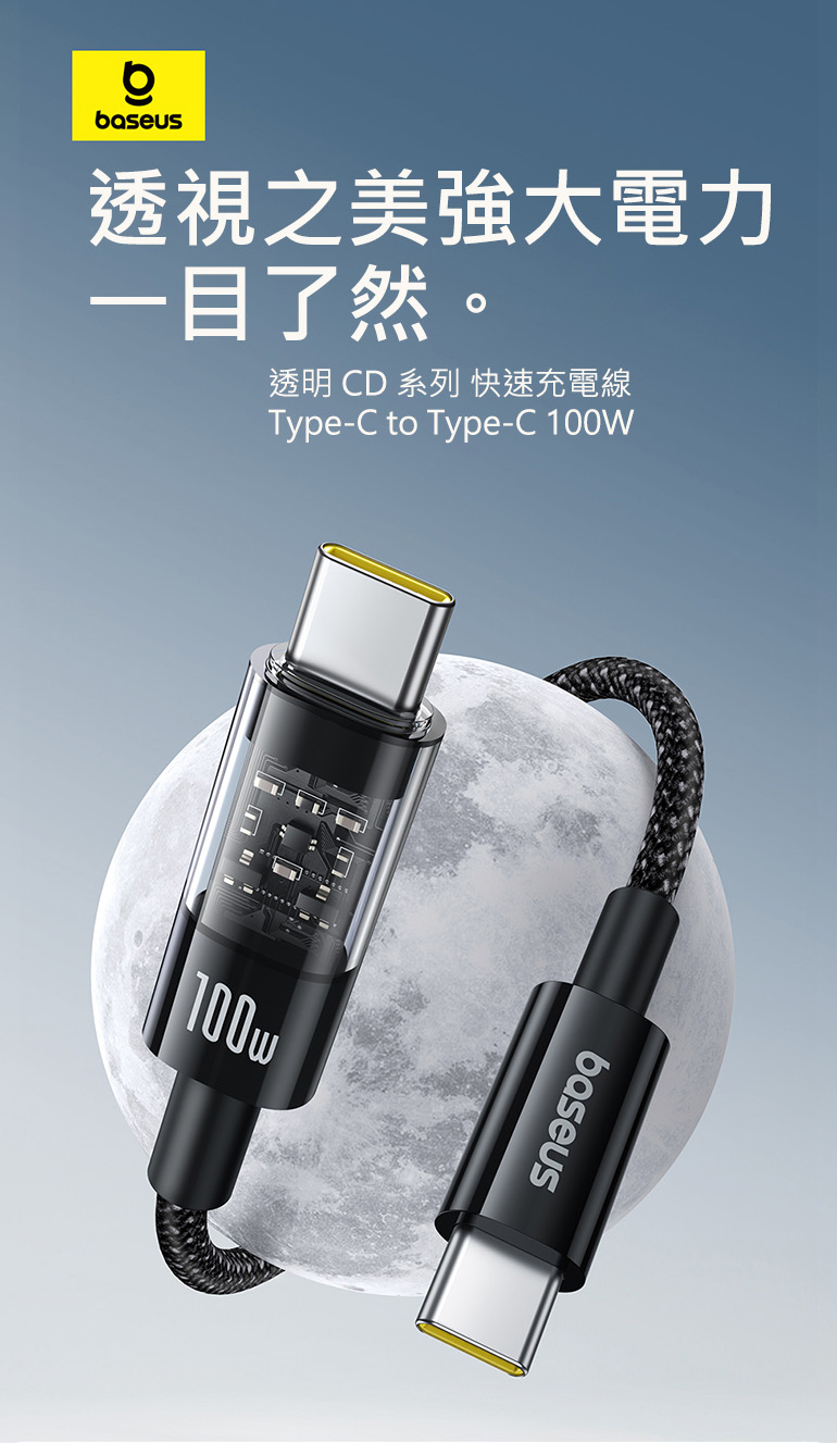 【Baseus倍思】透明CD系列 Type-C 100W 快速充電線 2M|星曜黑