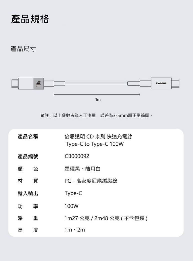 Baseus 倍思|Type-C to Type-C 100W 快速充電線 2m|星曜黑