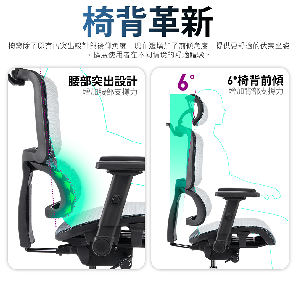 • 椅背前傾式角度設計,提供舒適的伏案辦公坐姿支撐