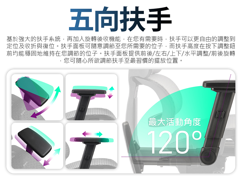 • 獨家5D調整扶手,可收折設計提高便利性