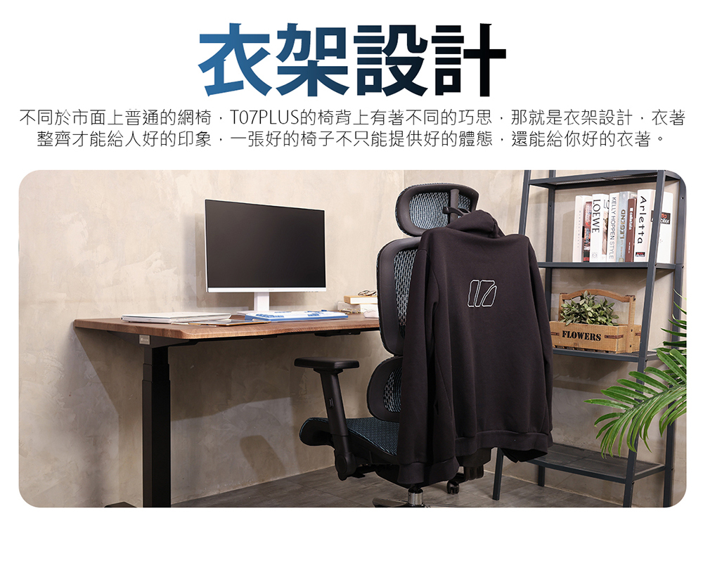 • 椅背可升降調整,並附有衣架,方便消費者使用