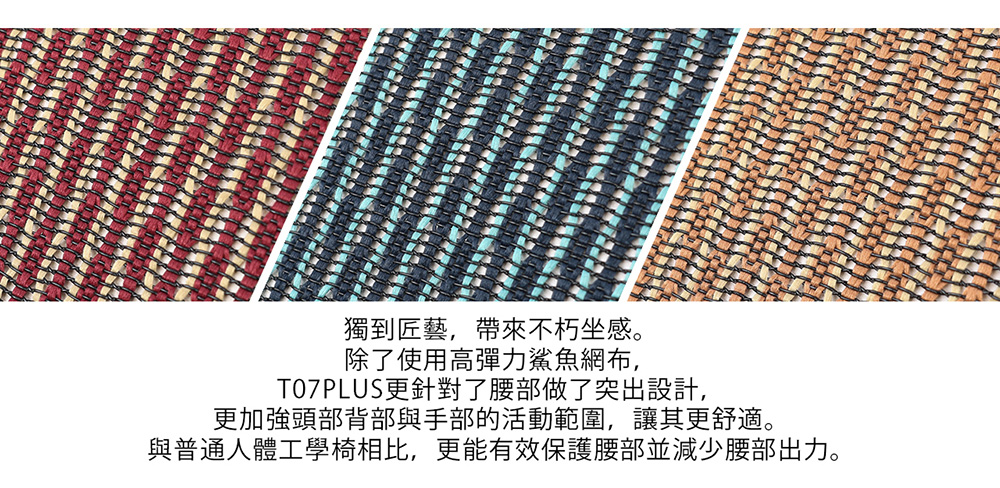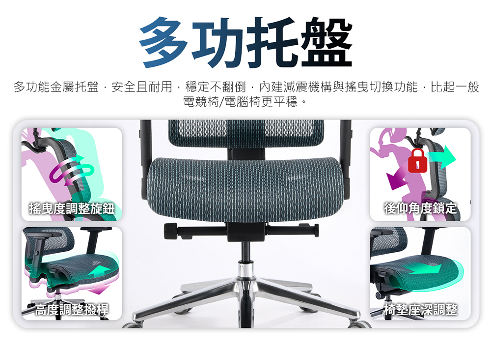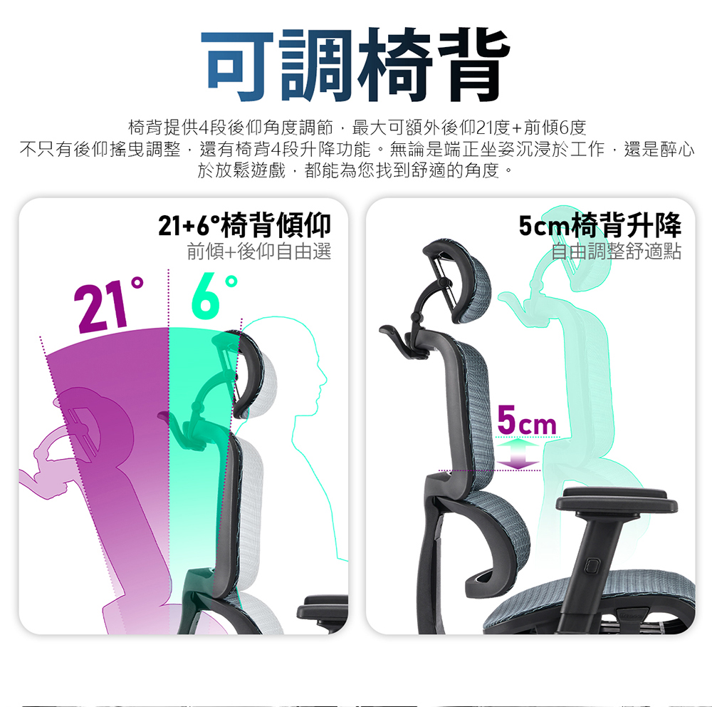 • 人體工學椅背,兼具後傾壓力調整鈕及固定功能
