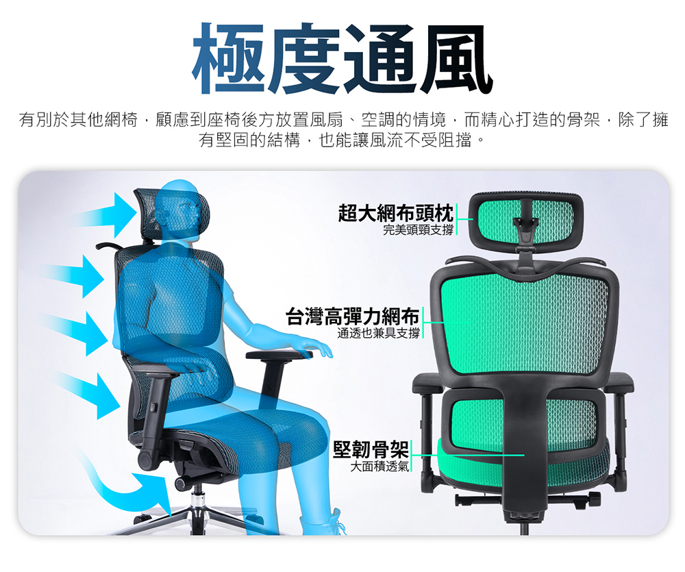 • 採用高彈力網布,全面通風設計