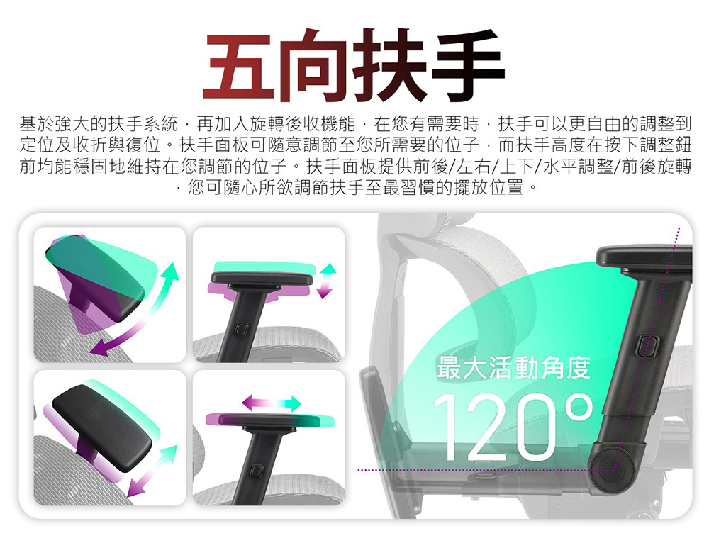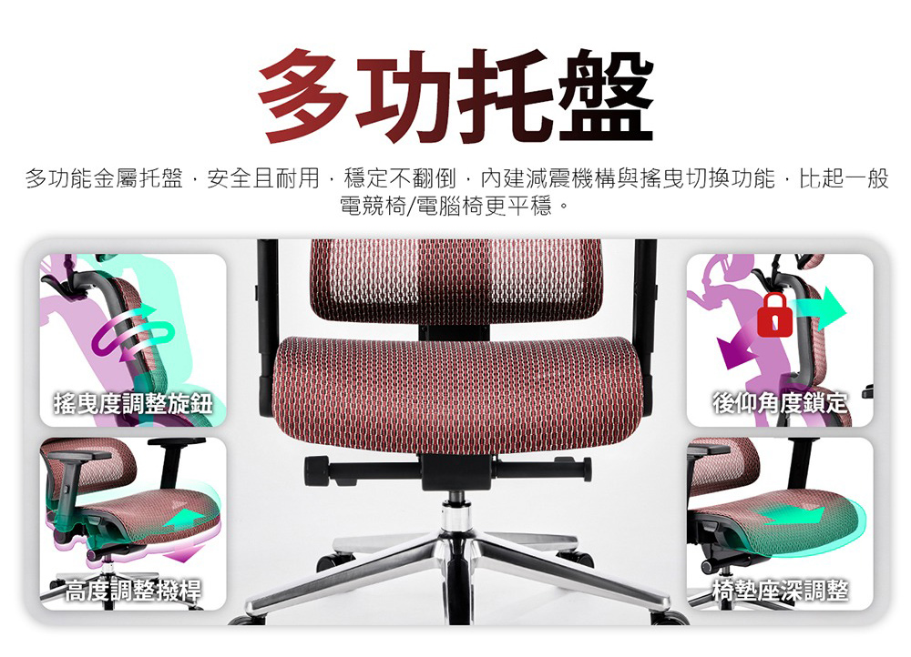 • 人體工學椅背,兼具後傾壓力調整鈕及固定功能
