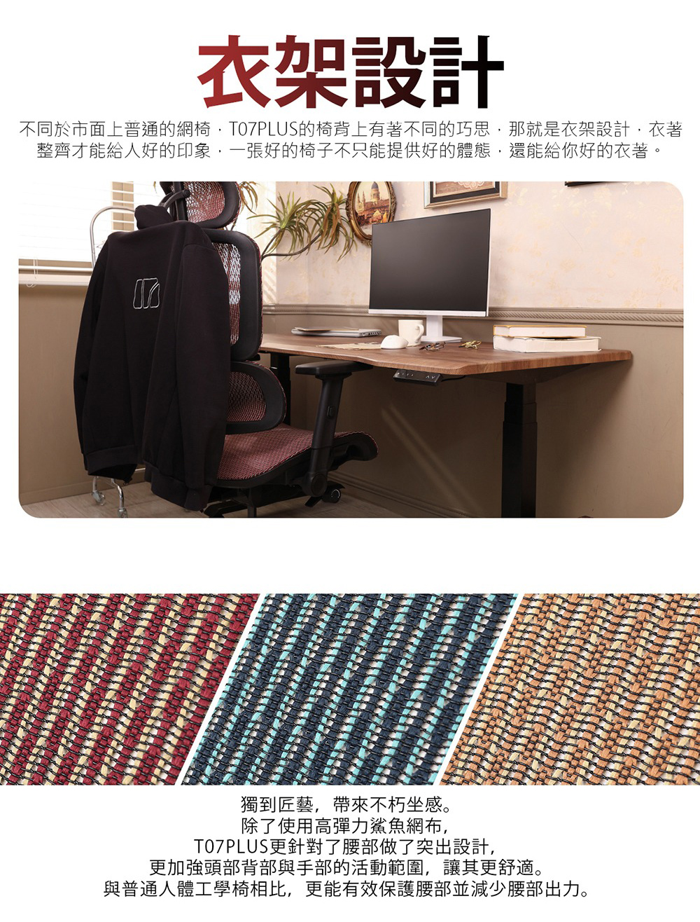 • 椅背可升降調整,並附有衣架,方便消費者使用