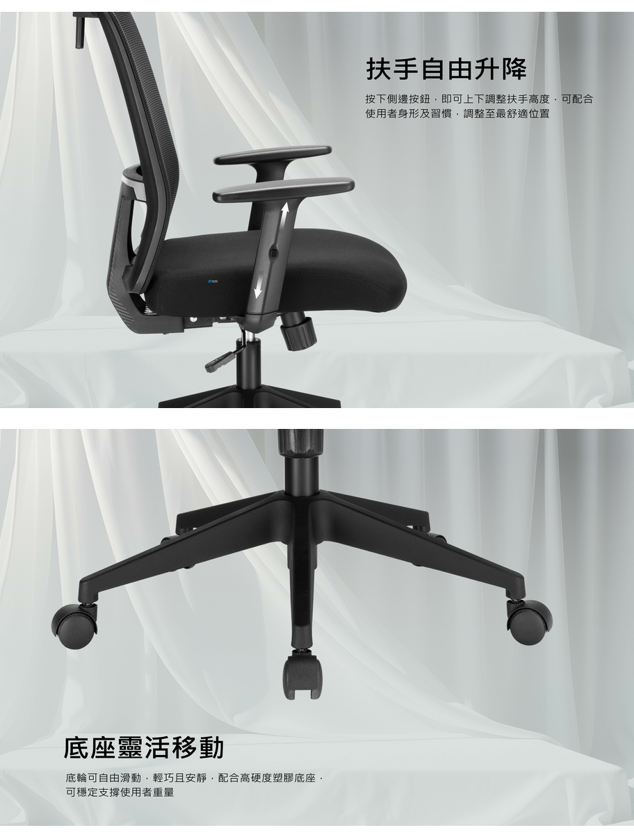 [商品規格] 尺寸(寬x深x高):67.5x51x111-121cm (26.6吋x20.1吋x43.7吋-47.6吋) 承重能力:120kg(264磅) 表面材質:網眼布料 框架材質:高強度玻璃纖維、尼龍 背部傾斜範圍:125° 扶手類型:高度可調扶手 氣動槓桿類型:100mm Class 3 級氣壓桿 基座類型:320mm尼龍塑膠底座 腳輪類型:50mm尼龍腳輪 機制類型:一檔式,90°鎖定機制 可調整枕靠:有 可調整腰間支撐:有 包裝尺寸:620x320x590mm 產品淨重/毛重:11.0/12.8kg 保固:非人為因素損壞保固一年
