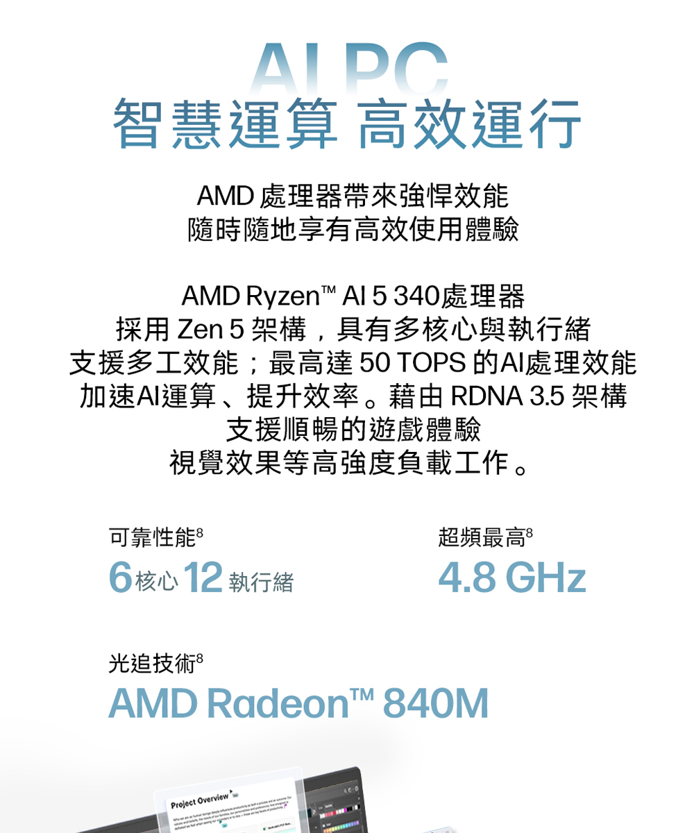 • 顯示卡:AMD Radeon 840M Graphics/支援AMD FreeSync
