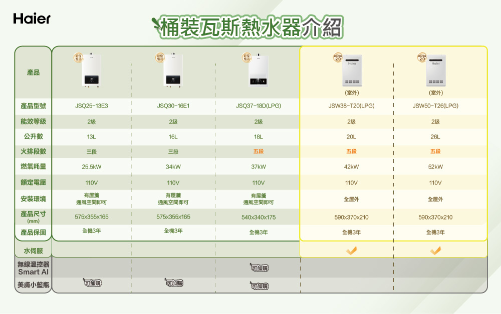 注意事項 →下單後約2-5個工作天內出貨,非快速出貨及安裝,急需安裝請透過實體通路購買,謝謝! →請優先確認安裝環境,也可搜尋官方LINE@haierpro詢問,若技師到場無法安裝須支付空趟費600元。 →基本安裝零件不包含額外耗材,實際耗材費用與服務費由安裝技師現場報價。 →本商品經安裝後,若非商品本身故障瑕疵因素,恕無法退換貨。 →此機型為桶裝瓦斯專用款。 →台東地區暫無配送。 →保固限使用自來水。