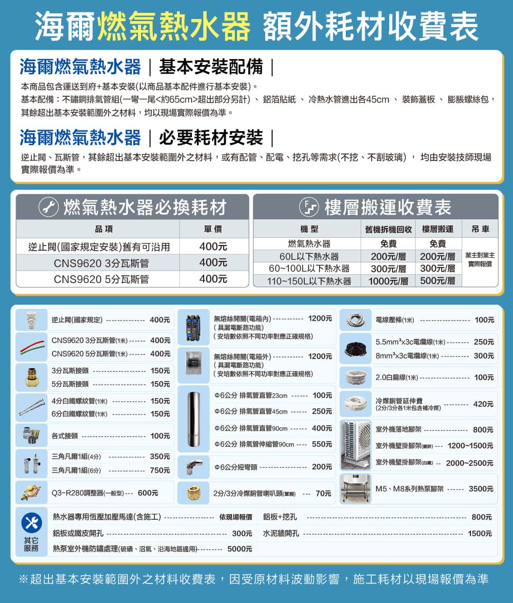 注意事項 →下單後約2-5個工作天內出貨,非快速出貨及安裝,急需安裝請透過實體通路購買,謝謝! →下單前請確認安裝環境及燃氣氣別,若技師到場無法安裝須支付空趟費600元。 →基本安裝零件不包含額外耗材,實際耗材費用與服務費由安裝技師現場報價。 →本商品經安裝後,若非商品本身故障瑕疵因素,恕無法退換貨。 →保固限使用自來水。