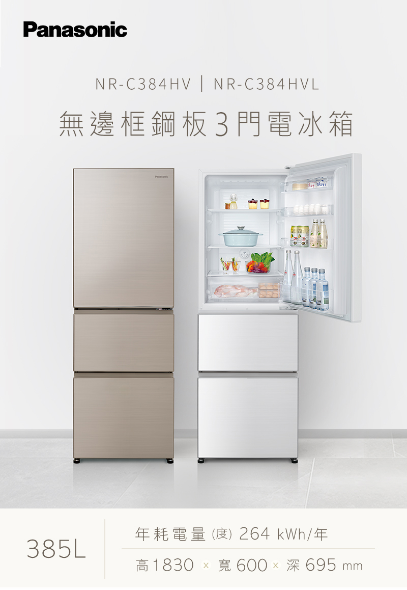 國際牌|385L 三門變頻左開冰箱 NR-C384HVL-W1 晶鑽白|含基本安裝