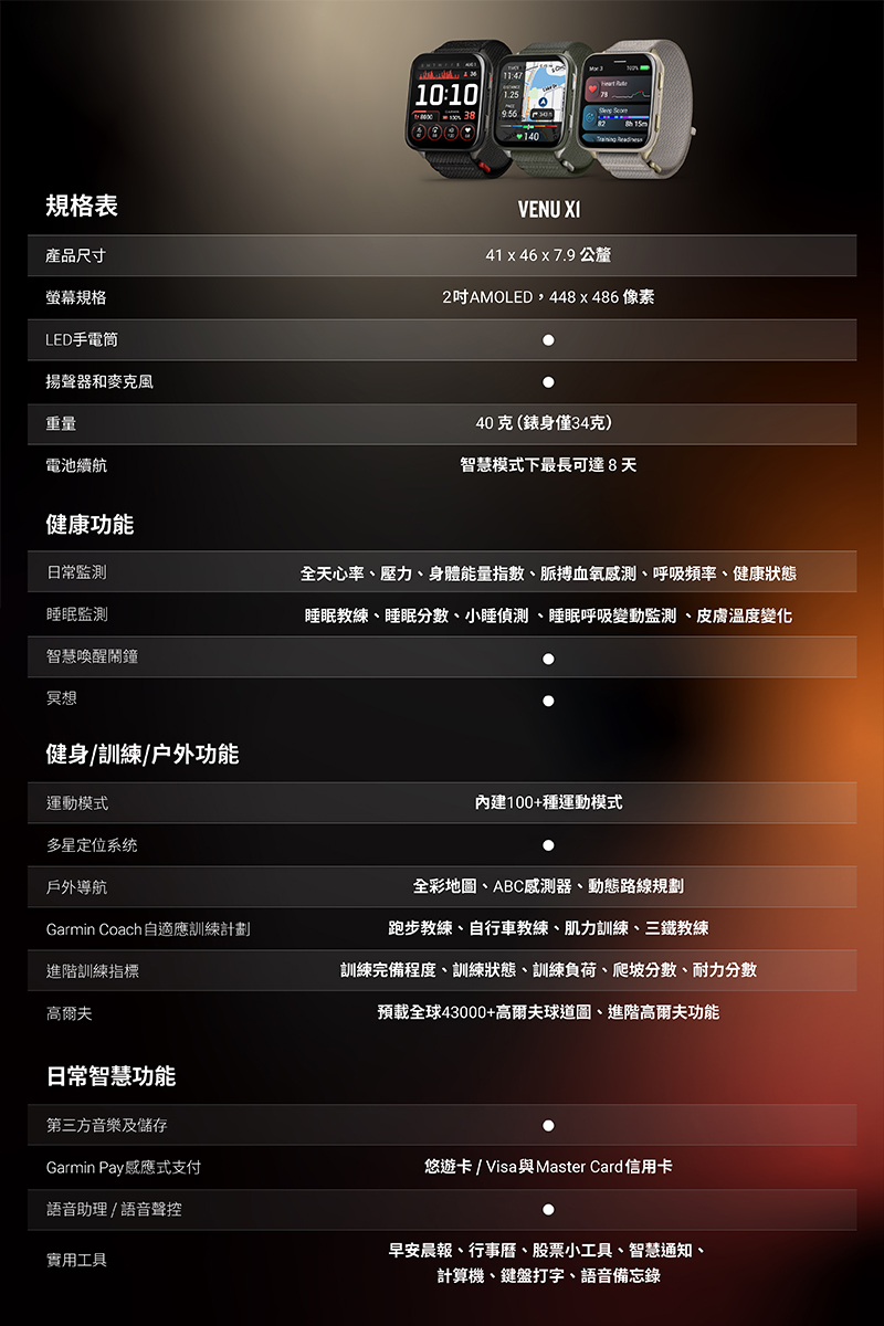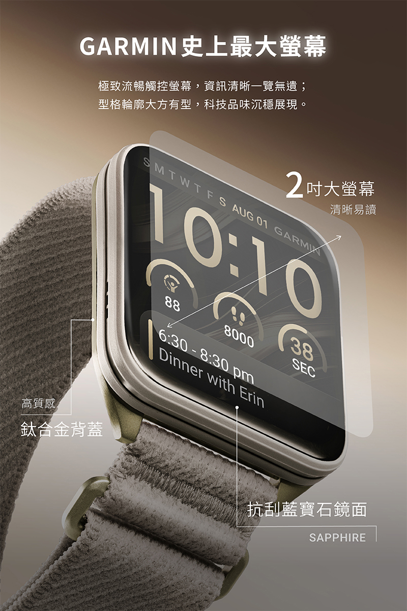 • 特色:2 吋 AMOLED 螢幕 | 抗刮藍寶石鏡面