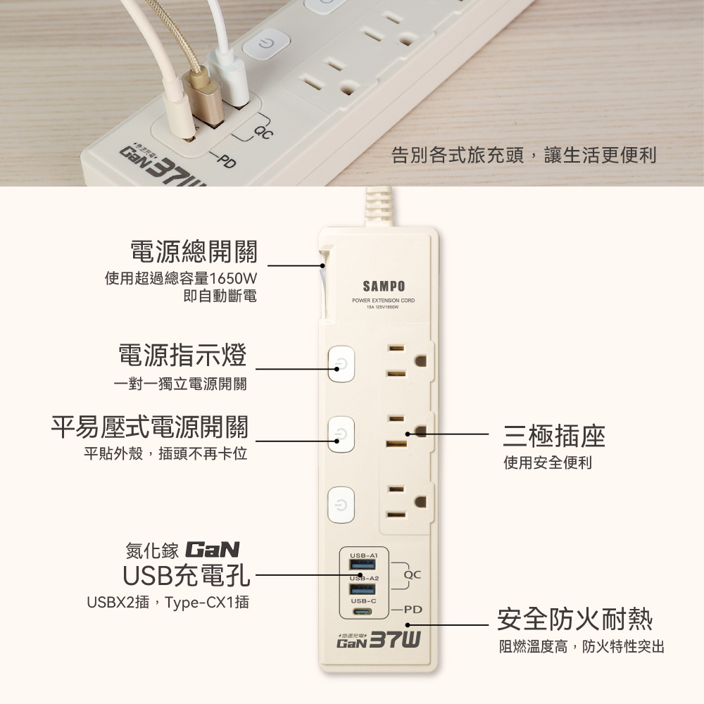 【SAMPO 聲寶】EL-W43R6U3A 四開三插 延長線 1.8M