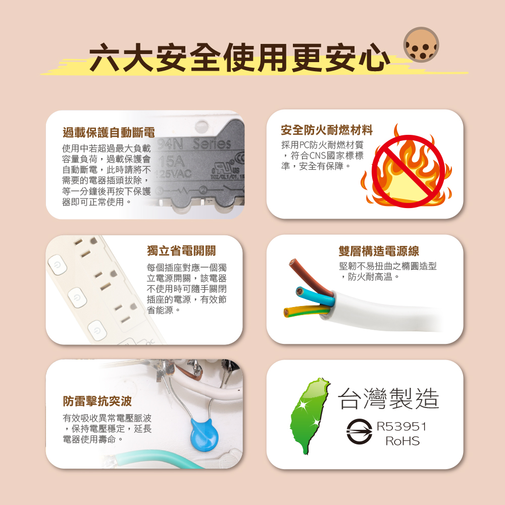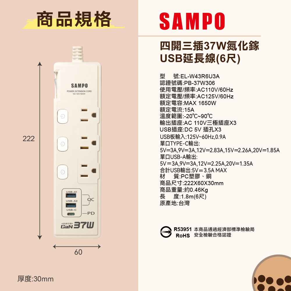 SAMPO 聲寶|EL-W43R6U3A 四開三插 延長線 1.8M