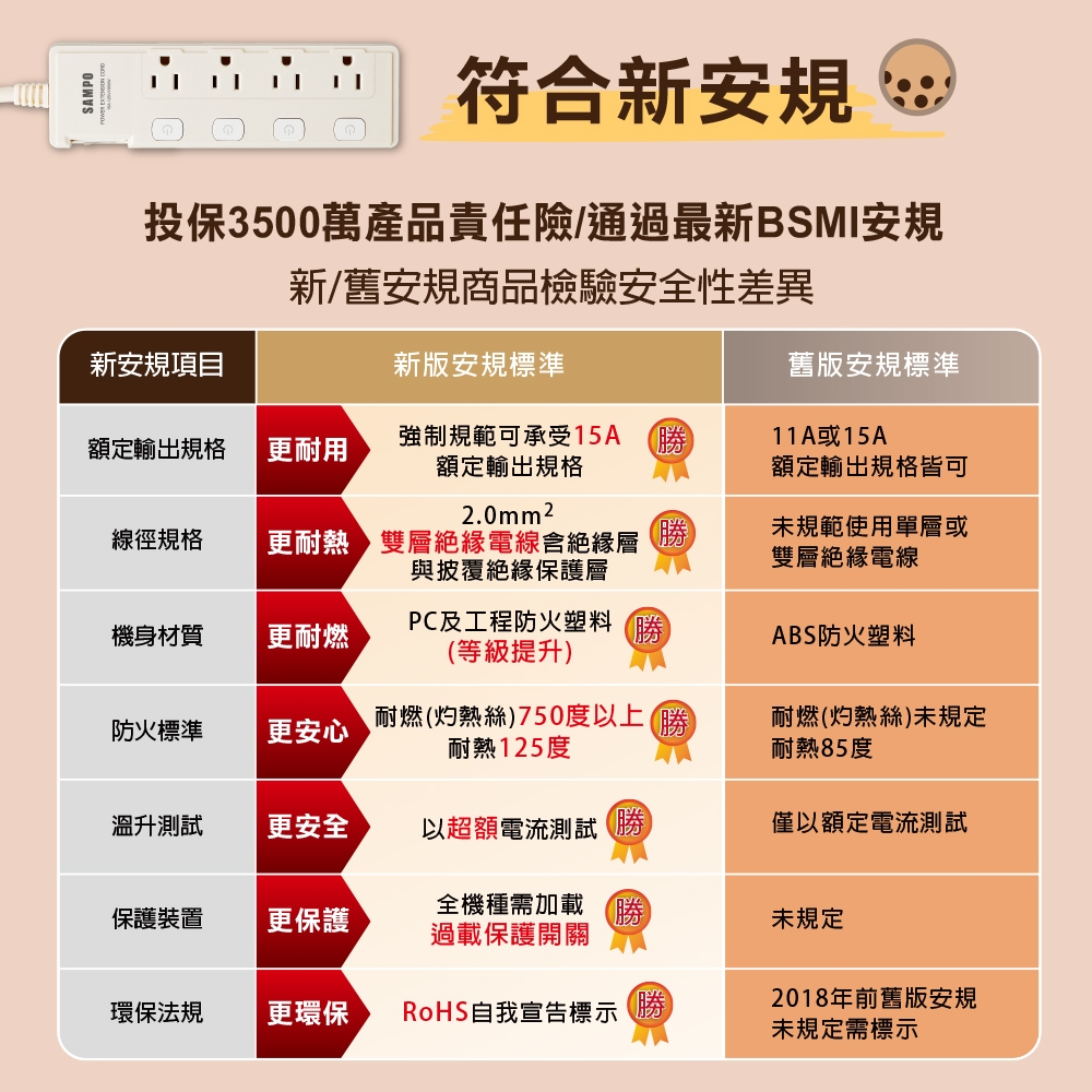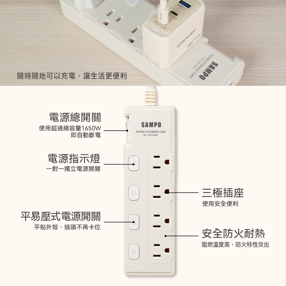 SAMPO 聲寶|EL-W54R12TA 五開四插 延長線 3.6M