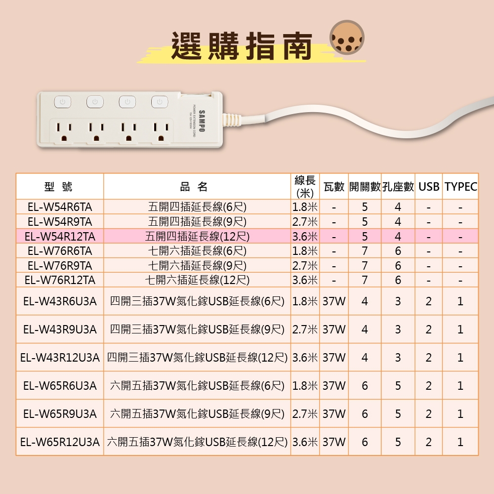 【SAMPO 聲寶】EL-W54R12TA 五開四插 延長線 3.6M
