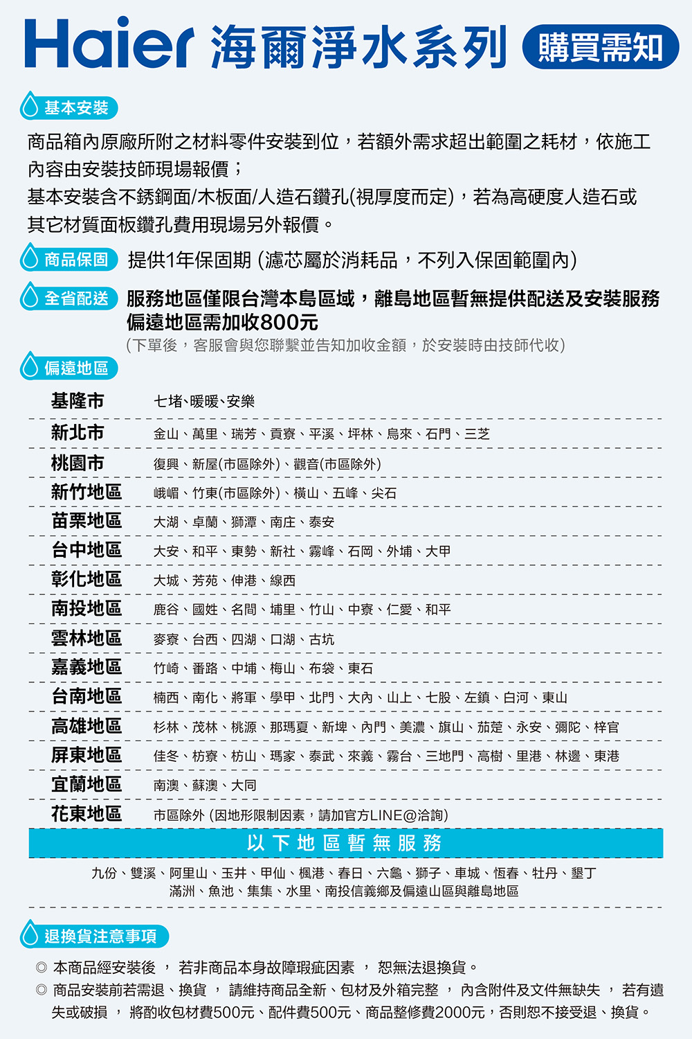 注意事項 →請優先確認安裝環境,也可搜尋官方LINE@haierpro詢問,避免技師到場無法安裝產生空趟費600元。