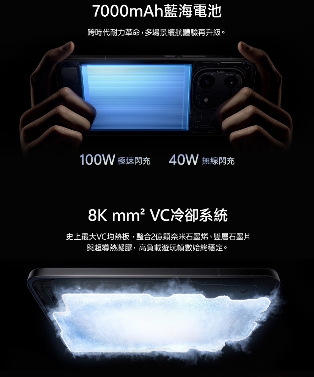 • 電池容量:7000mAh 超大電量 100W極速閃充+40W無線閃充 (支持旁路充電)