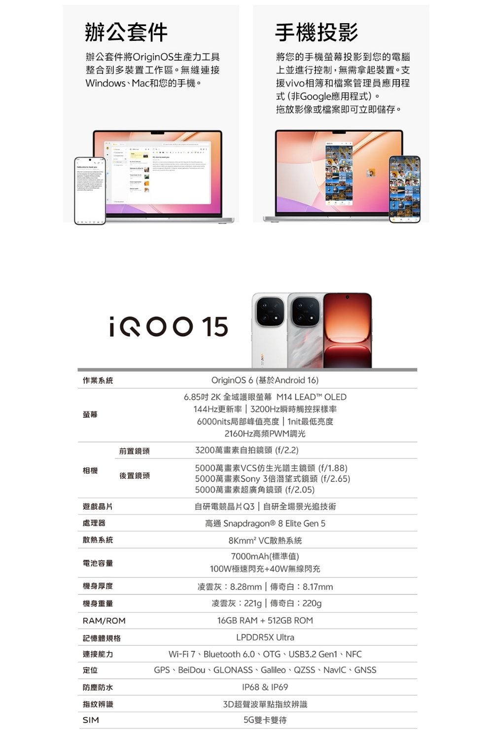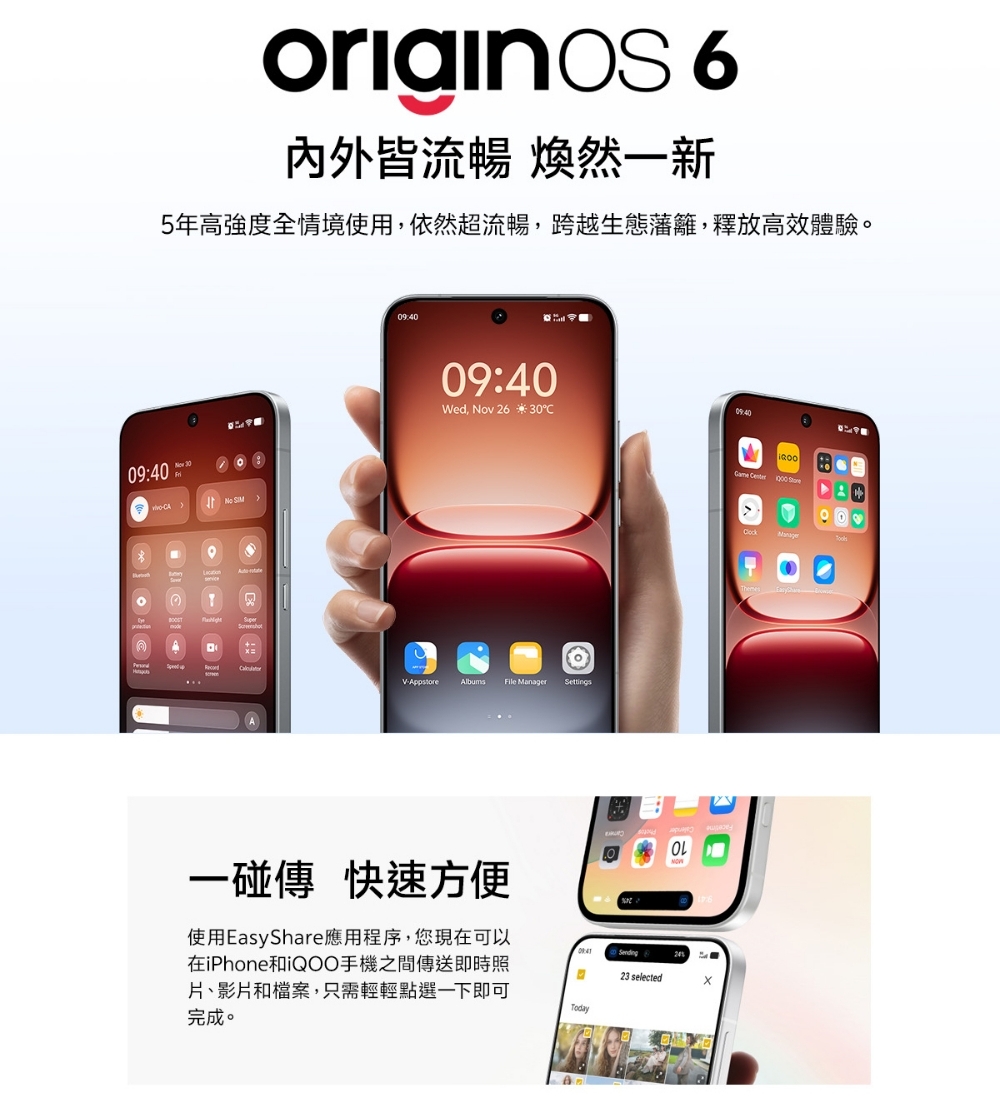 • 作業系統平台:Android 16 作業系統/OriginOS 6 操作介面