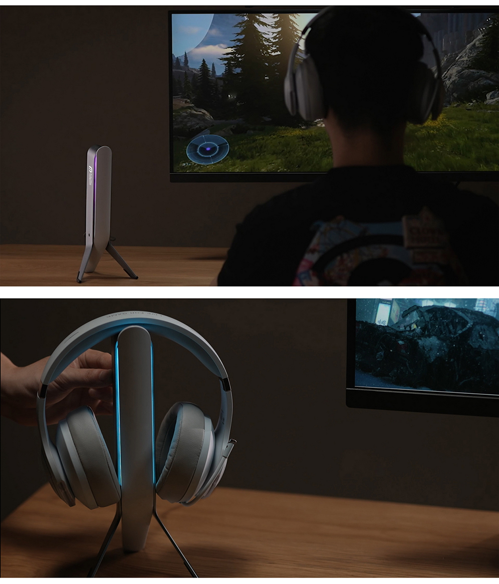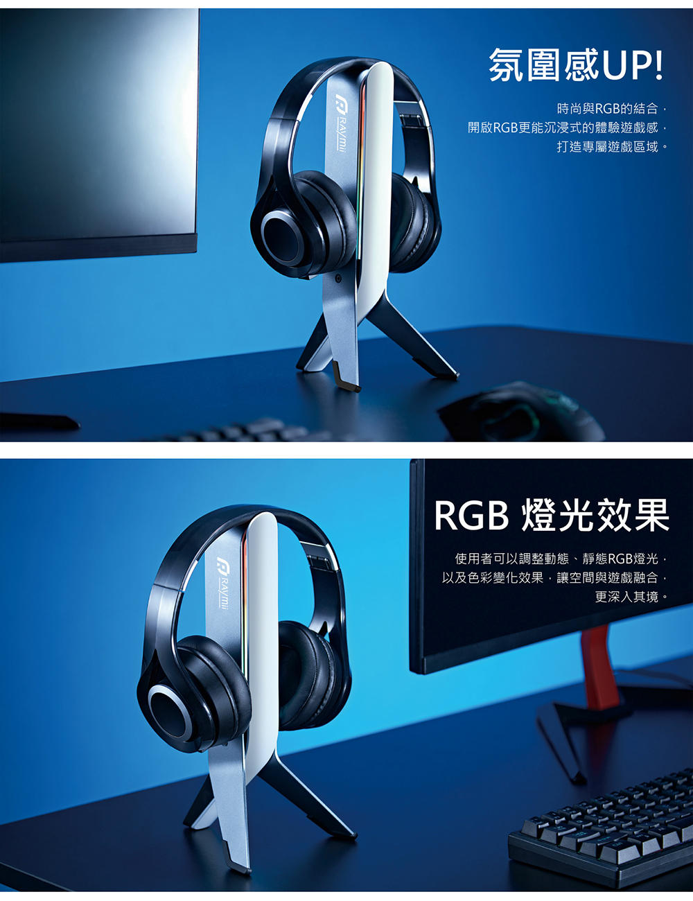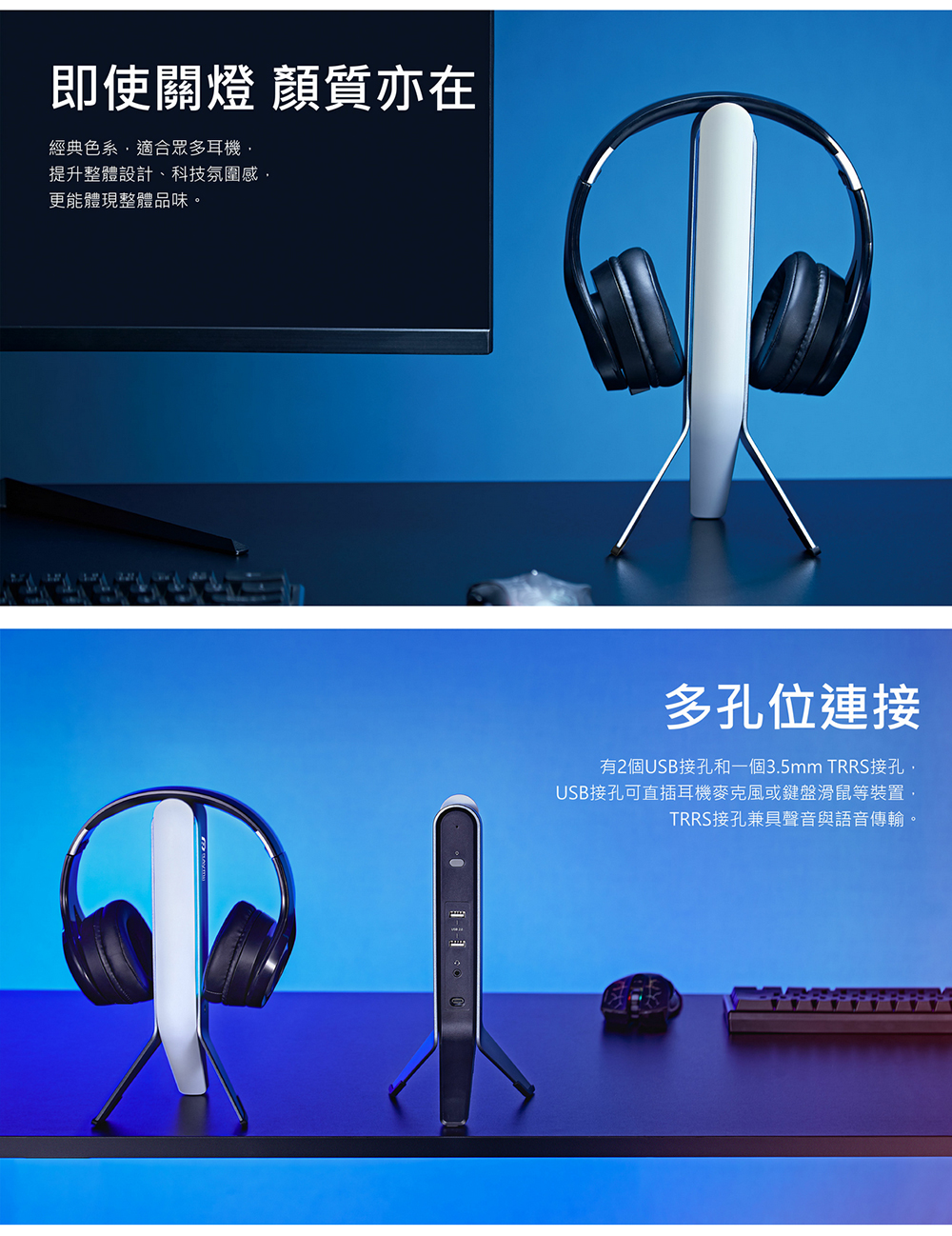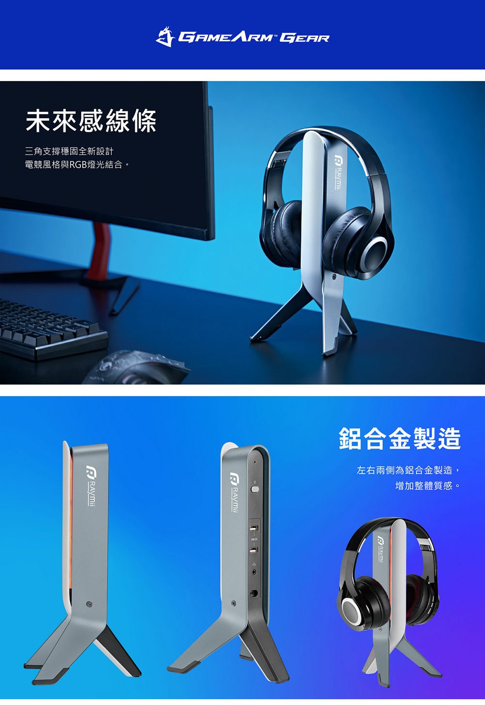 [商品描述] 1. GameArm GEAR耳機支架是專為電競愛好者打造的創意收納方案,彰顯極客風範,匯聚眾人目光焦點 2. 使用高級航空鋁合金製作,表面採用陽極氧化處理,霧面質感永不生鏽,永不掉色,時尚美觀,堅固耐用 3. 精心設計的三腳站立結構,能節省擺放空間,同時重心穩固不傾倒,並適用於絕大多數耳機 4. 啟發於專業RGB電競光效的設計理念,支架內嵌RGB LED發光元件,打造與環境一體的沉浸式遊戲氛圍效果 5. 只需要輕按支架上的按鈕,即可輕鬆切換多種動態RGB燈光效果,並能夠呈現幻彩燈條特有的彩虹流光霓彩效果 6. 支架包含強大的集線擴展功能,具備2個USB端口和一個用於音頻和麥克風連接的3.5mm TRRS端口 7. USB接口可直接用於耳機/麥克風/鍵盤/滑鼠/隨身碟等USB裝置,即插即用,簡單好用 8. 3.5mm的TRRS端口兼具音頻與語音傳輸,能同時輸入與輸出聲音,可用於帶有麥克風的耳機 9. 底座下有矽膠墊片,可穩固位置與保護桌面,防刮防滑