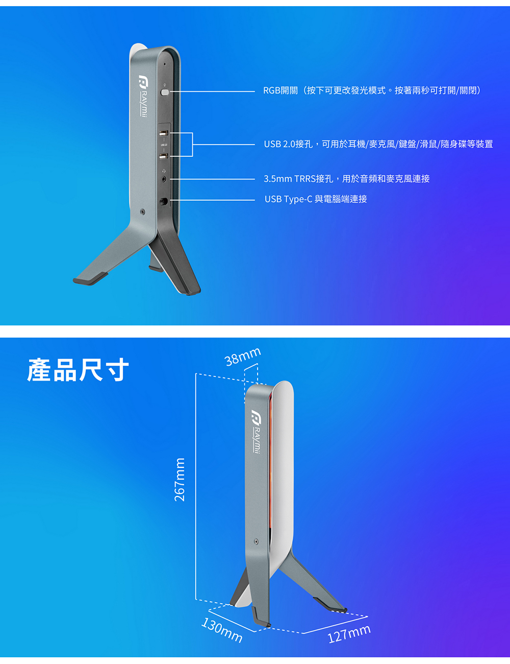 [商品規格] 材質:鋁合金,金屬,ABS,PC,矽膠 尺寸:127x130x267mm 盛重:1KG 接口規格:1xTYPEC (連結電腦主機) / 2xUSB2.0 / 1x3.5mm TRRS二合一音源孔 內含:耳機支架,主機連結線材 包裝尺寸:291x143x140mm 產品淨重/毛重:0.40/0.60kg 保固:非人為因素損壞保固一年