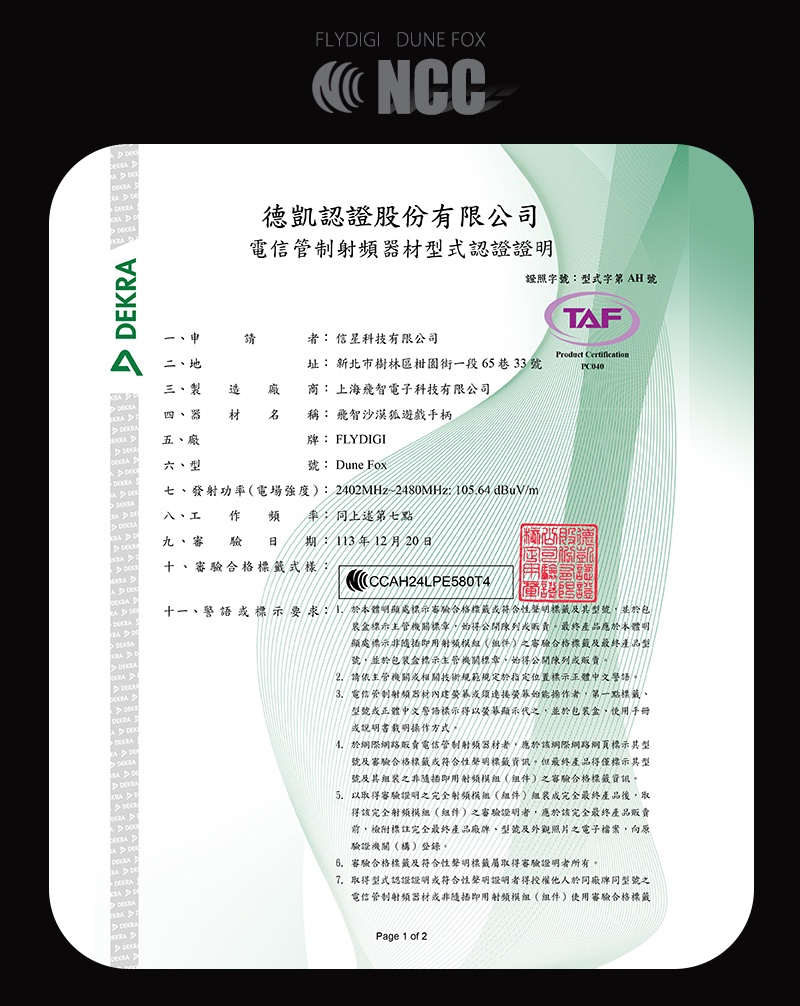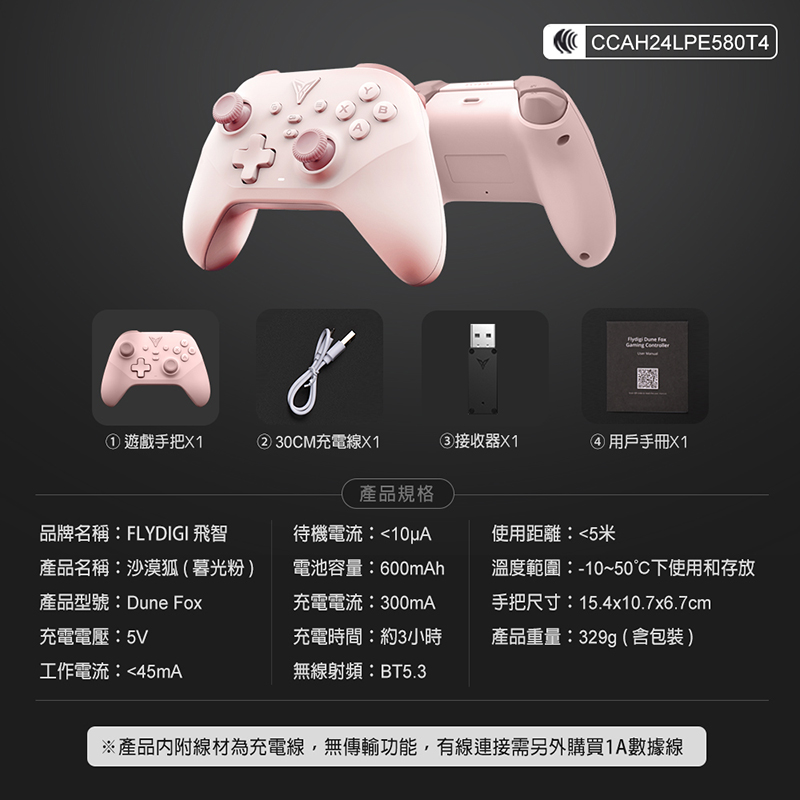 【規格說明】 充電電壓:5V 工作電流:<40mA 待機電流:<10μA 電池容量:800mAh 充電電流:800mA 充電時間:約2小時 無線射頻:BT5.0 使用距離:<10米 溫度範圍:-10~50℃下使用和存放 充電線長:1.5米 手把尺寸:15.5x10x5cm 產品重量:375g(含包裝) 產品內容:遊戲手把x1、充電線(USB to TypeC)x1、接收器x1、用戶手冊x1