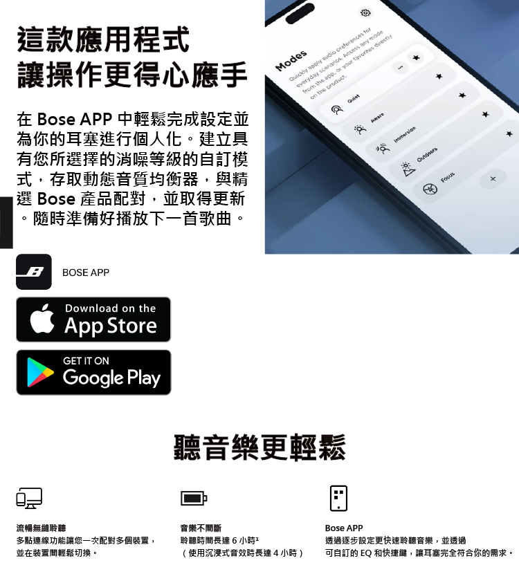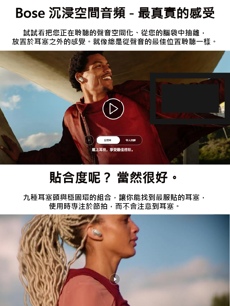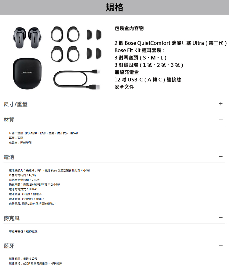 【產品規格】 🔹耳塞:高 1.2 公分 x 寬 2 公分 x 深 2.4 公分(7.7 公克) 🔹無線充電盒:高 6.6 公分 x 寬 5.9 公分 x 深 2.7 公分(61.23 公克) 🔹USB 連接線:30.5 公分 🔹耳塞:塑膠(PC-ABS)、矽膠、金屬,防汗抗水(IPX4) 🔹耳套:矽膠 🔹充電盒:硬殼塑膠 🔹電池續航力:長達 6 小時¹ (使用 Bose 沉浸空間音頻則為 4 小時) 🔹耳塞充電時間:1 小時 🔹充電盒充電時間:3 小時 🔹快充時間︰充電 20 分鐘即可使用 2 小時³ 🔹電池充電方式:USB-C 🔹電池類型(耳塞):鋰離子 🔹電池類型(充電盒):鋰離子 🔹自動開啟/關閉功能可保持電池續航力 🔹單邊耳塞各 4 組麥克風 🔹藍牙範圍:長達 9 公尺 🔹無線連接:A2DP 藍牙音訊串流、HFP 藍牙