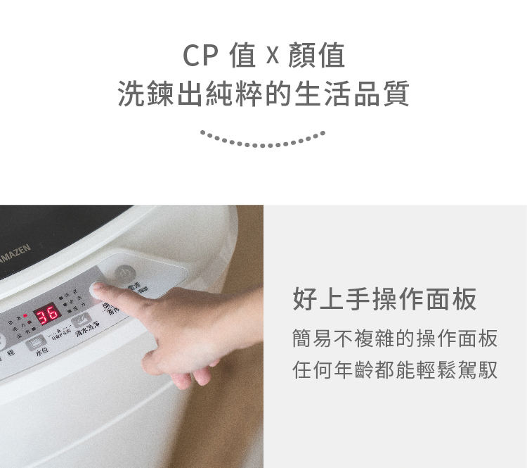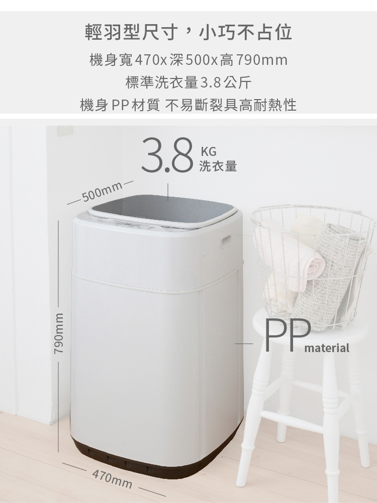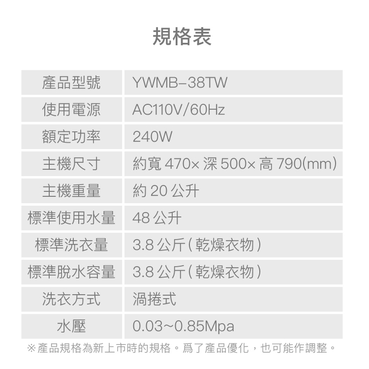 【YAMAZEN山善】3.8kg直立輕巧型不鏽鋼速洗衣機YWMB-38TW 貼身親密內衣內褲衣物 兒童寶貝衣服 【商品特色】 ● 13分鐘快速洗衣 ● IPX-4防潑水機身 ● 3.8kg洗衣量,小巧不佔位 ● 6道洗衣行程,滿足日常需求 ● 洗脫低分貝,輕聲耳語不打擾 ● 430不鏽鋼洗衣內槽,耐用防汙 ● 機身側邊凹槽握把,輕鬆搬遷超便利 ● 智能省水系統,依據洗衣量自動調節水量