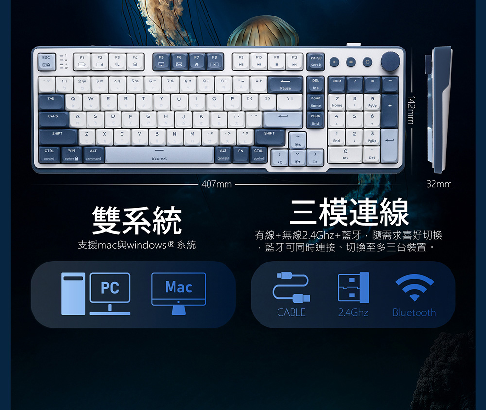 • 連線模式:藍牙/2.4G/有線USB-C 三介面