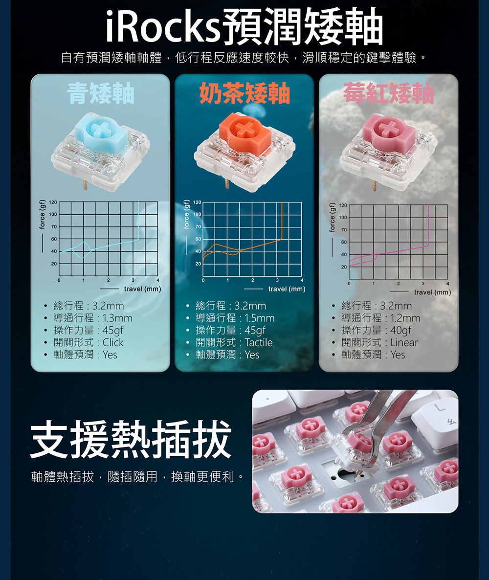 • 特色:全鍵區採用iRocks自有預潤矮軸軸體,可插拔及自行替換鍵軸
