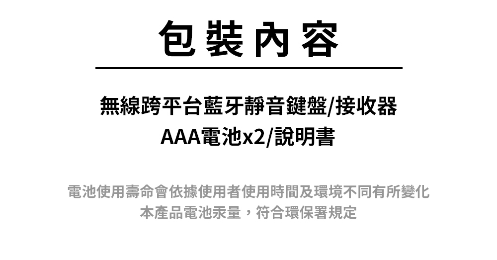 包裝內容無線跨平台藍牙靜音鍵盤/接收器/ AAA電池x2/說明書