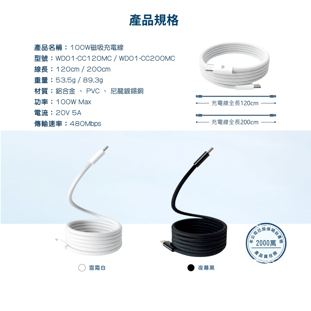 Wephone|USB-C to C 100W 磁吸充電線 2M 黑色