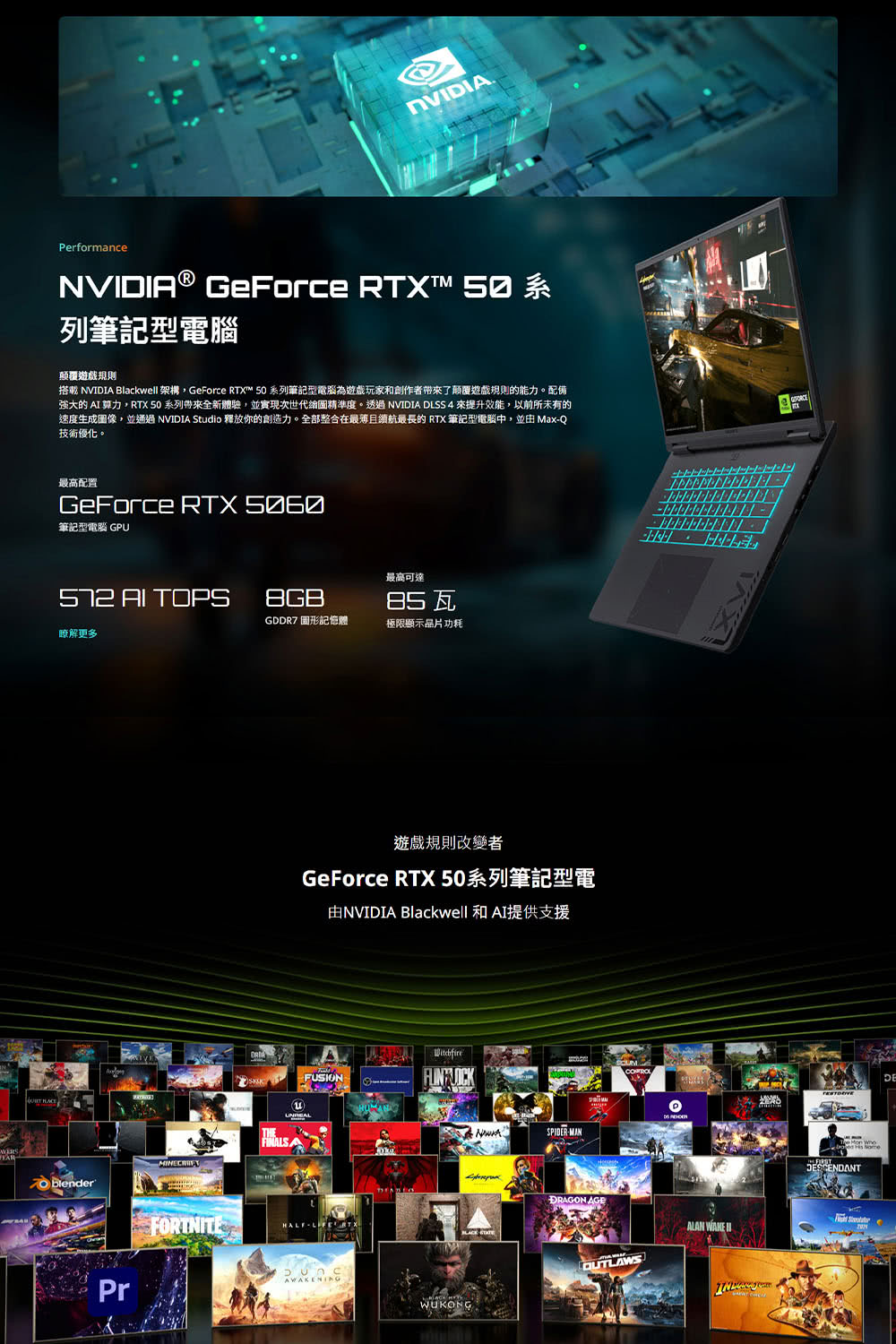 • 顯示卡:NVIDIA GeForce RTX 5060 Laptop GPU 8GB GDDR7 Max. TGP 85W