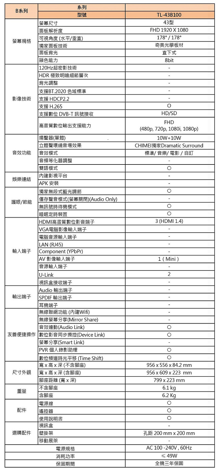 CHIMEI 奇美|TL-43B100 43型 低藍光顯示器|含運無安裝
